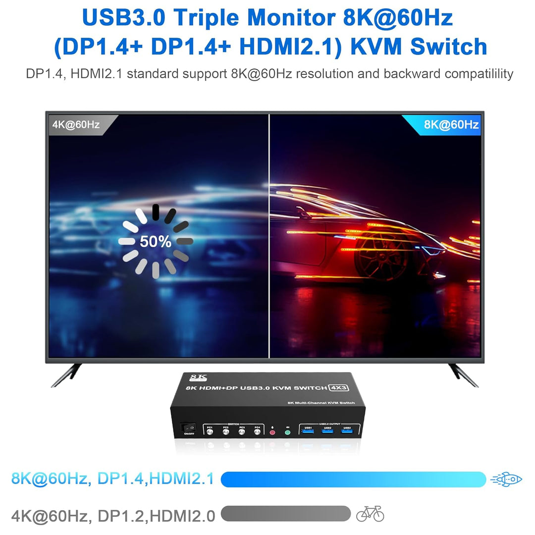 - KVM-Umschalter Dreifach-Monitor Ultra HD 8K@60Hz: Der HDMI 2.1, DP 1.4 Dreifach-Monitor (DisplayPort +DisplayPort +HDMI) 4Ports KVM-Umschalter unterstützt Auflösungen bis zu 8K@60Hz und abwärts. Bitte beachten Sie, dass Sie nur dann einen