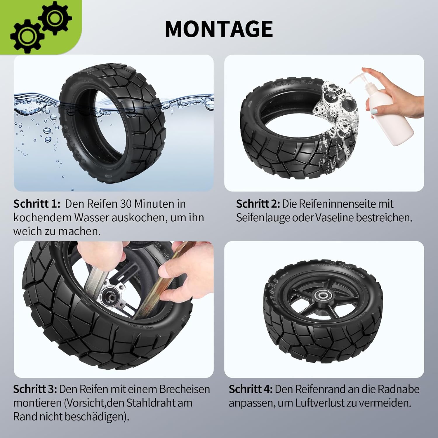 • [Vakuumreifen] Er bietet die Vorteile von Vollreifen und Luftreifen, Stossdämpfung, Verschleissfestigkeit, Explosions- und Pannensicherheit. Enthält kein selbstheilendes Gel. Wenn der Vakuumreifen eine Panne hat, kann er mit Reifenreparaturflüssigkeit
