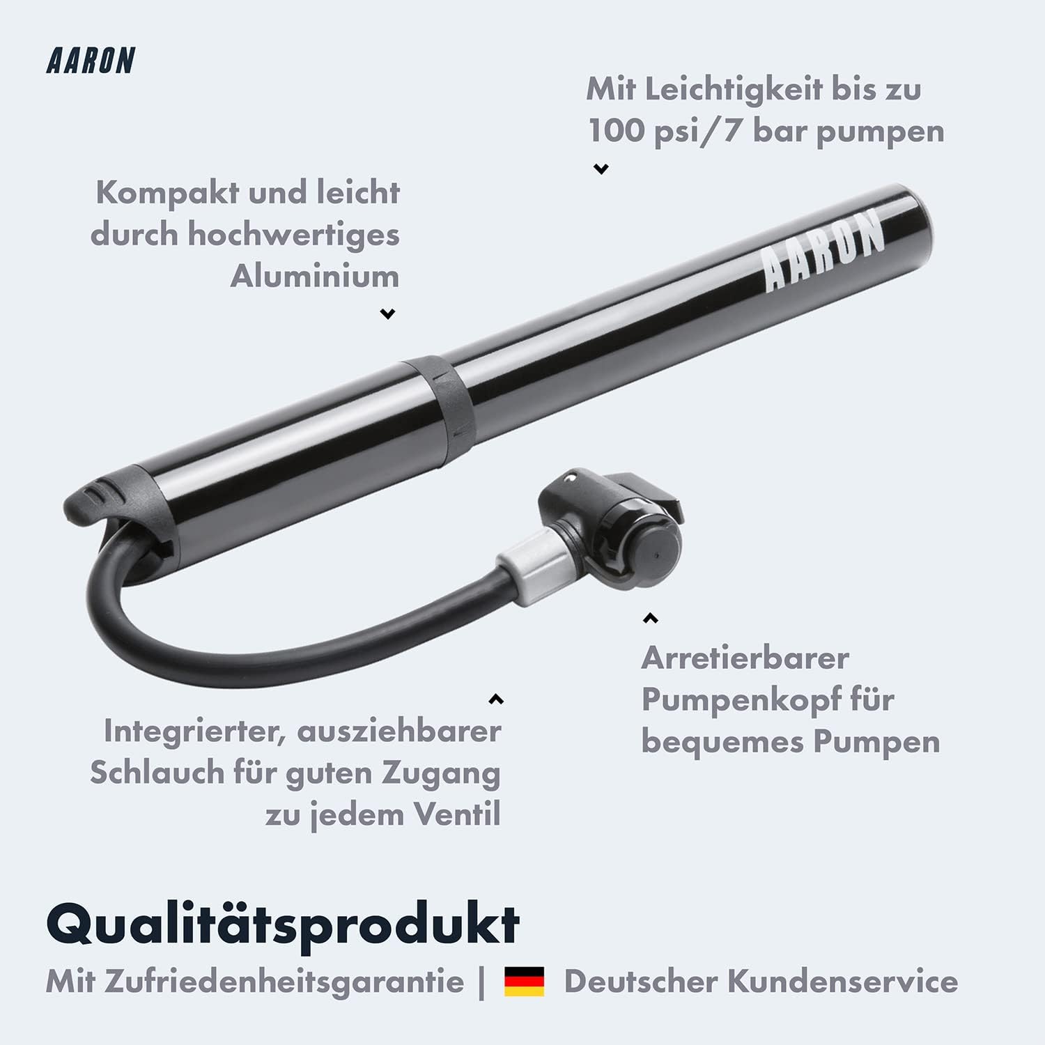 - ✅ SAUBERE UMWELT - Die Produkte von AARON zeichnen sich durch eine lange Lebensdauer aus. Die hochwertig verarbeitete AARON Pocket One Minipumpe wird so zu einem treuen, langfristigen Begleiter. Zusätzlich wird die Fahrradpumpe plastikfrei in einem Karton zu Dir geliefert.