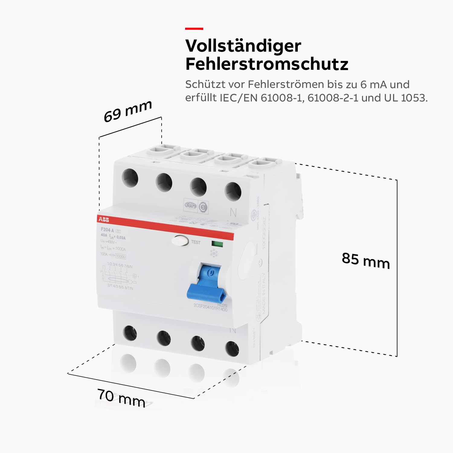 - ABB F200 RCCB, 4-polig, 40A, 30mA Typ A CE 400V ac