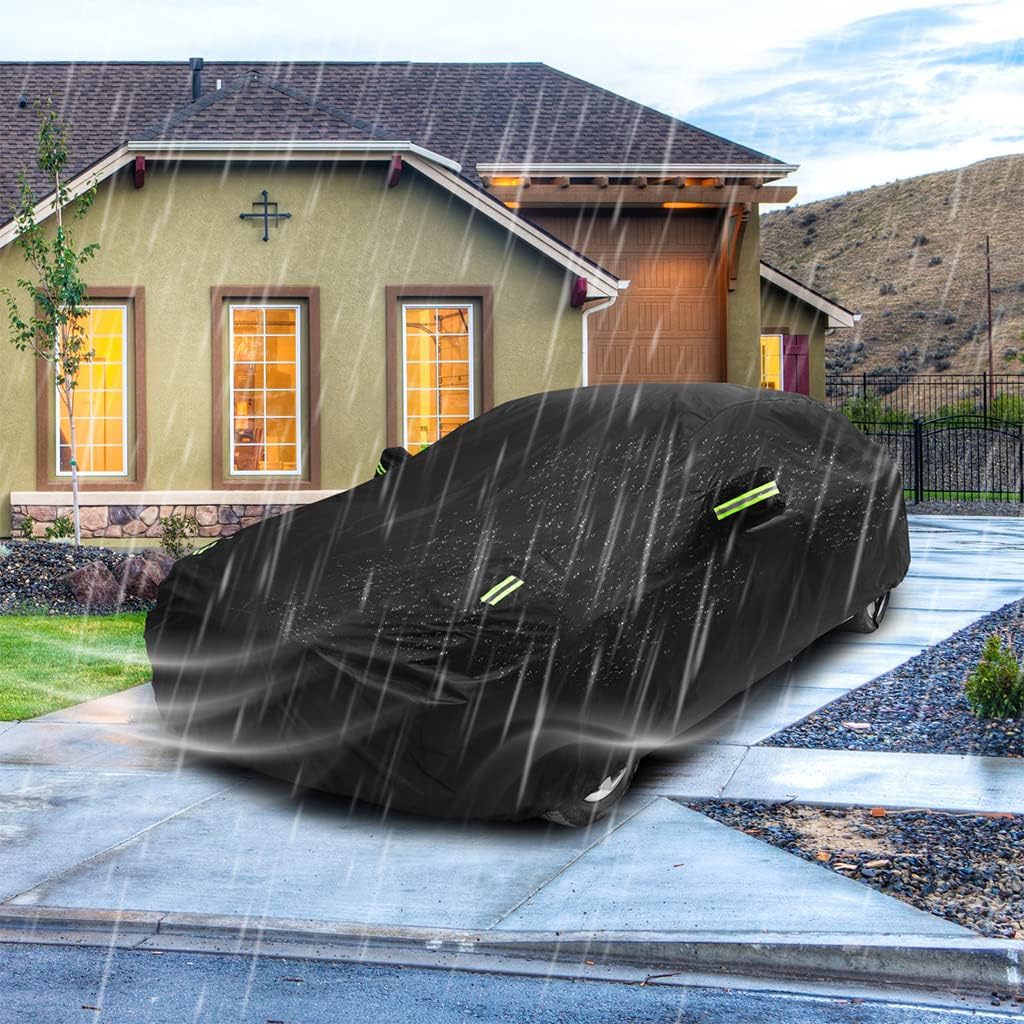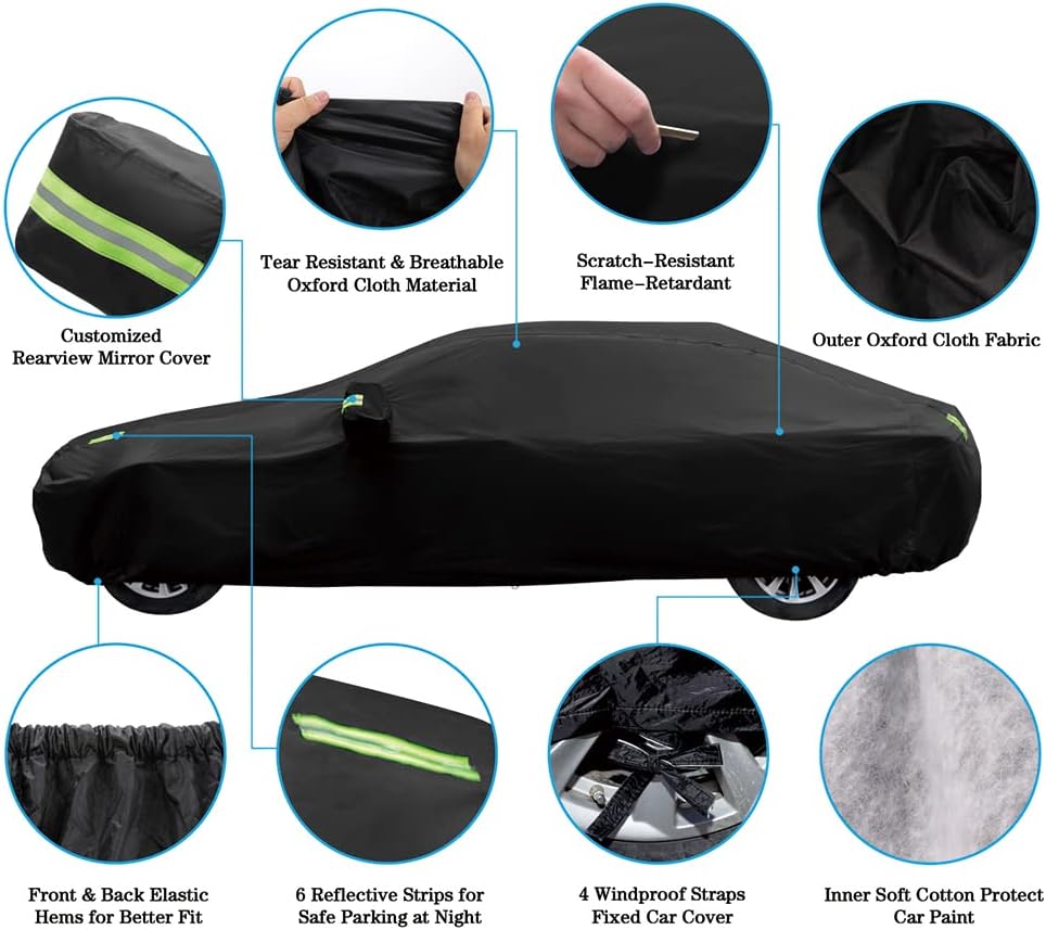 - 【Design】Die 6 fluoreszierenden Reflexstreifen zieren die Autohülle, um Ihr Auto nachts vor dem Aufprall eines anderen Fahrzeugs zu schützen. Die 4 winddichten Riemen unter dem Auto und der verstellbare elastische Saum vorne und hinten sorgen für