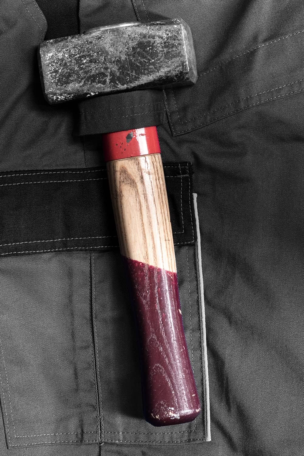 - 👛 Mit Schenkeltasche, Zollstocktasche, zwei Gesässtaschen sowie zwei grossen Werkzeug-Seitentaschen und einer Hammerschlaufe