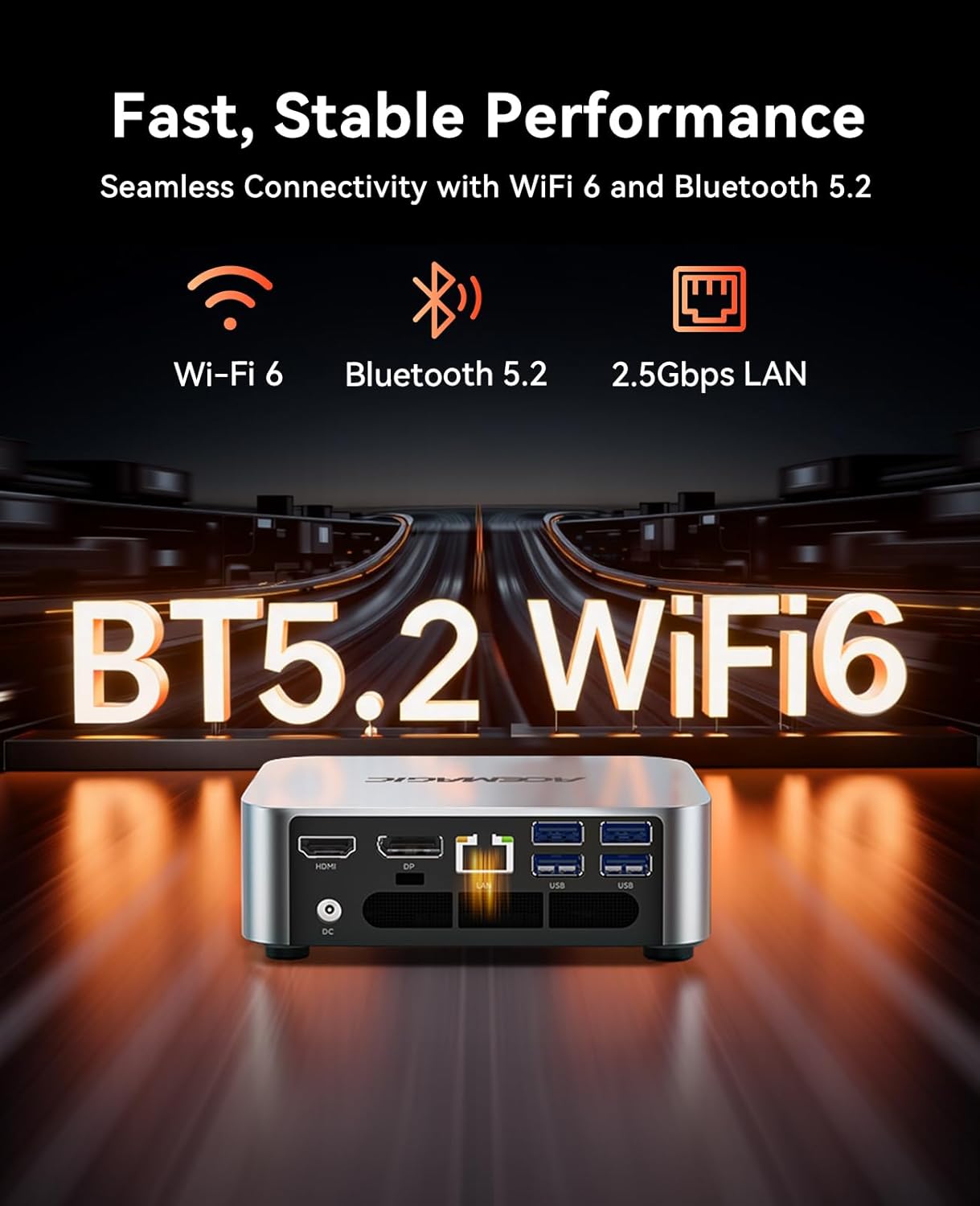- 【Klein, aber leistungsstark】 Im Vergleich zu herkömmlichen Desktop-Computern ist der ACE Mini-PC nur 5 x 5 x 2 Zoll gross. Design mit mehreren Schnittstellen (1 x HDMI-Anschluss, 1 x Typ-C, 1 x DP-Anschluss, 1 x DC-Anschluss, 1 x 2,5 G RJ45, 1 x 1 G