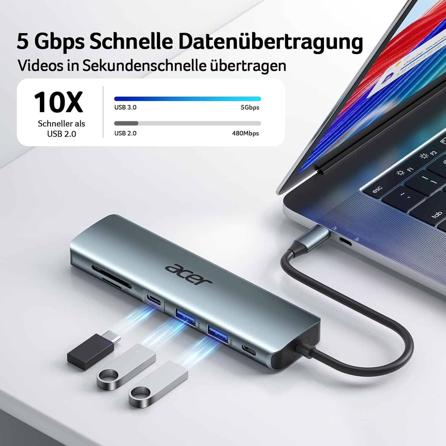 • 【7-in-1 Multiport】acer USB-C Splitter Hub ist aus Aluminium gefertigt und erweitert einen einzelnen USB-C-Anschluss auf 7 Anschlüsse (1*HDMI 4K@30HZ, 2*USB 3.0 (USB 3.1 Gen1), 1*USB-C 5Gbps, 1*Type-C PD 100W Ladeanschluss,