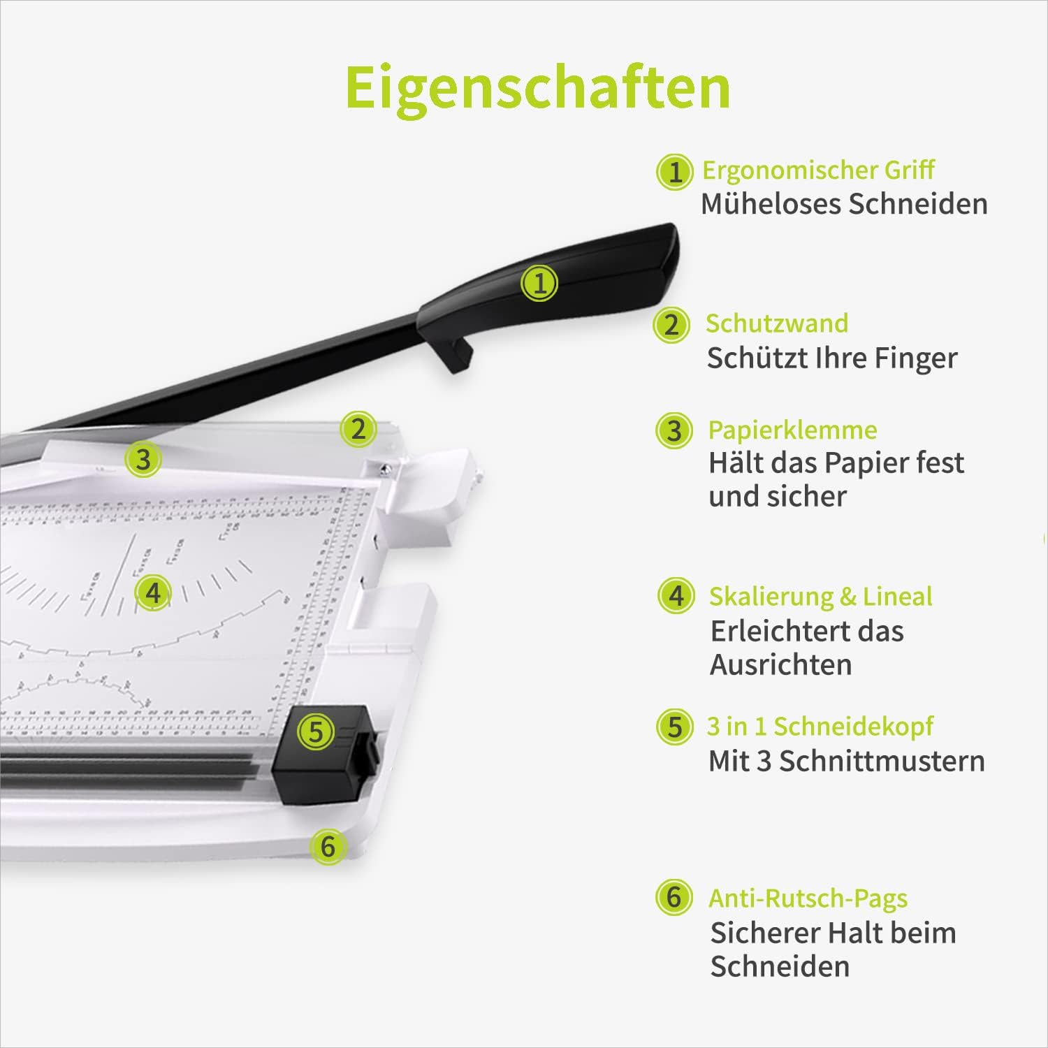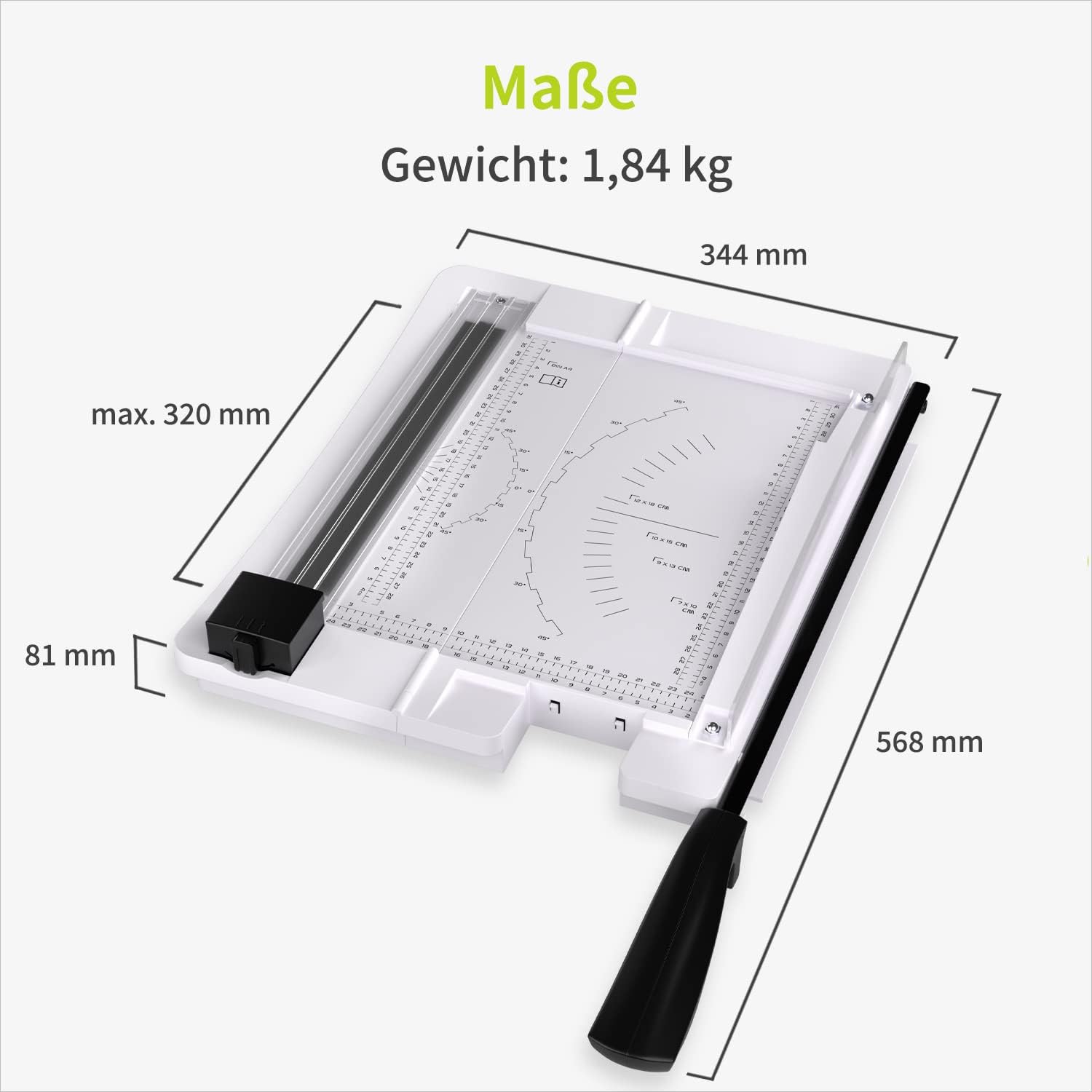 - ✂️ HOHE PRÄZISION - Schneiden Sie Fotos, Papier oder Bastelmaterial mit dem eingebauten Winkelbrett und Lineal unserer Schneidemaschine auf den Millimeter genau.