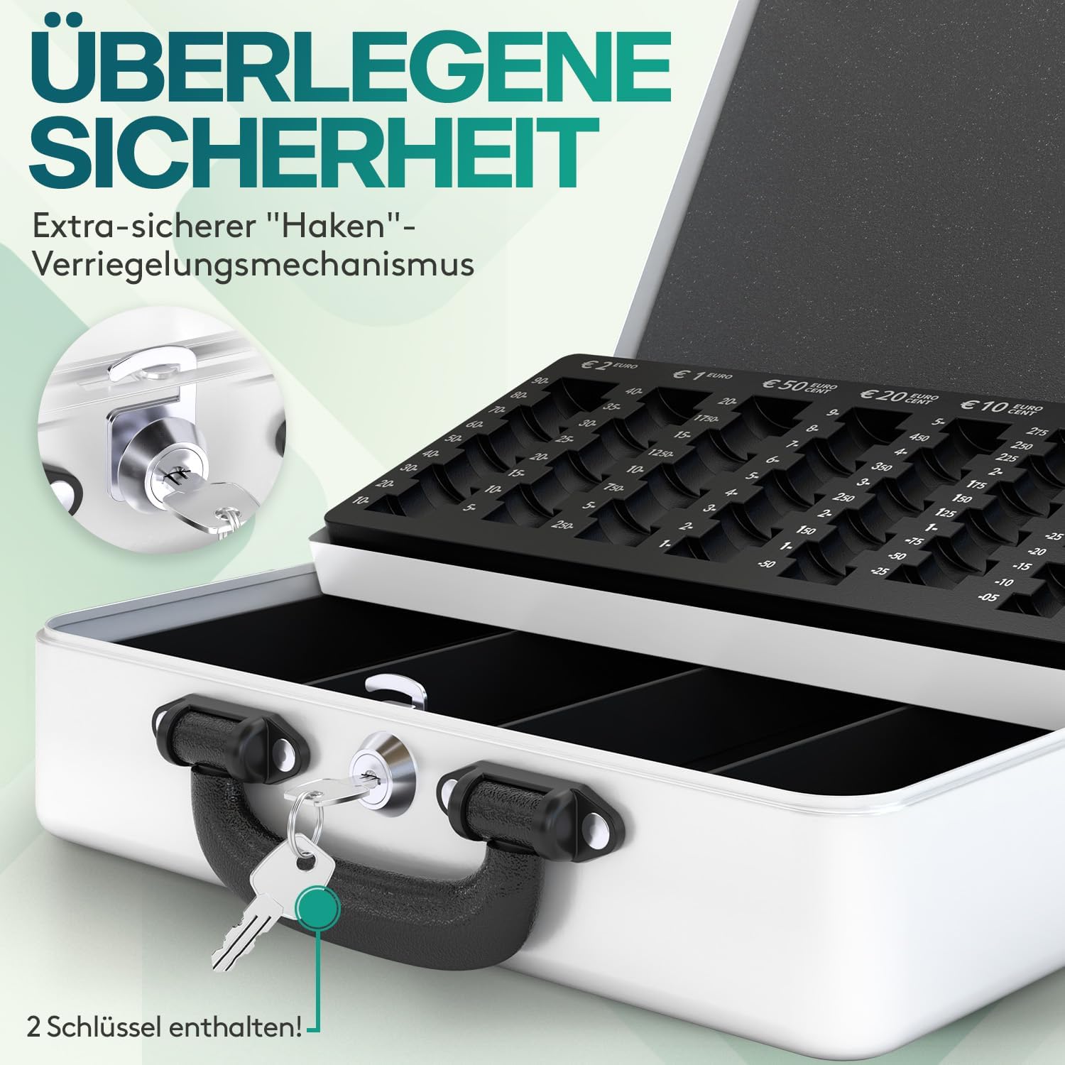 - Geldkassette zum abschliessen - Das Gehäuse besteht aus 25% dickerem Metall und wurde zusätzlich mit einer kratzfesten und rostsicheren Beschichtung veredelt. 2 Schlüssel zum Abschliessen für die Kasse werden mitgeliefert