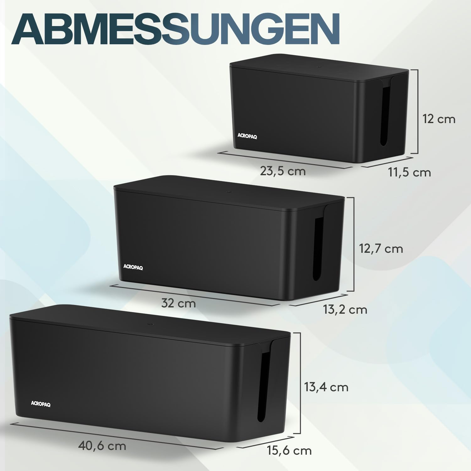 - 3 in 1 Set - Wir bieten unsere beliebte Kabelbox jetzt auch in einem 3er Set an mit folgenden Grössen: Wir bieten Kabelbox Gross (40,6 x 13,4 x 15,6 cm), Kabelbox Medium (32 x 13,2 x 12,7 cm) und Kabelbox Klein (23,5 x 12 x 11,5 cm)