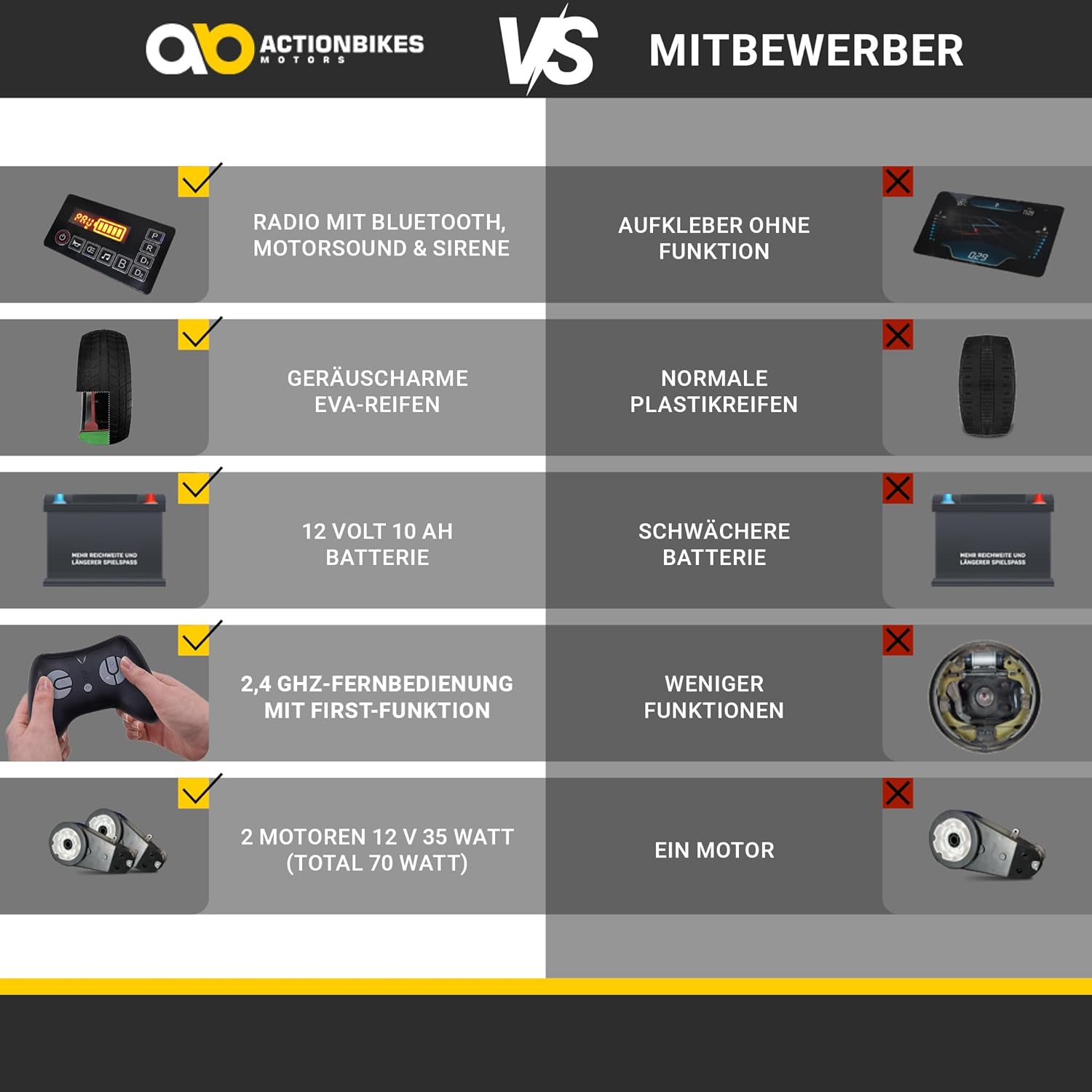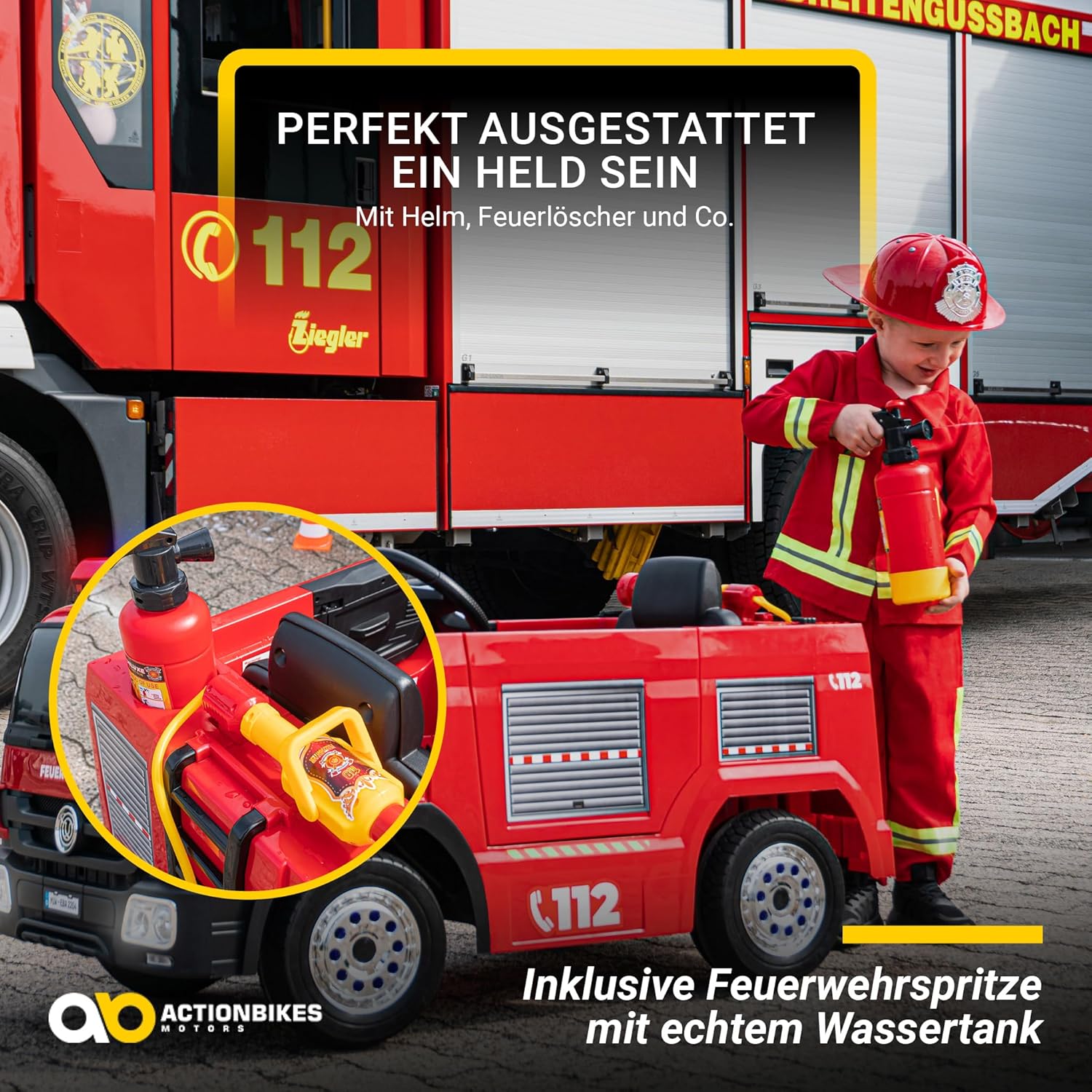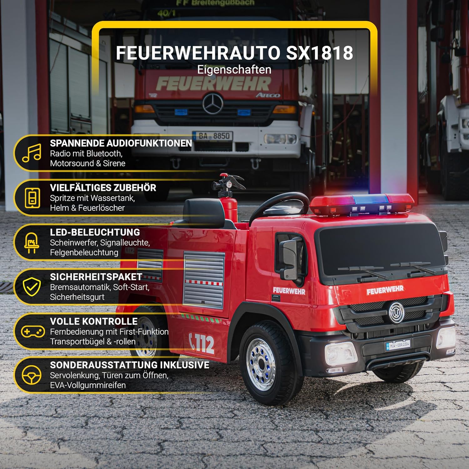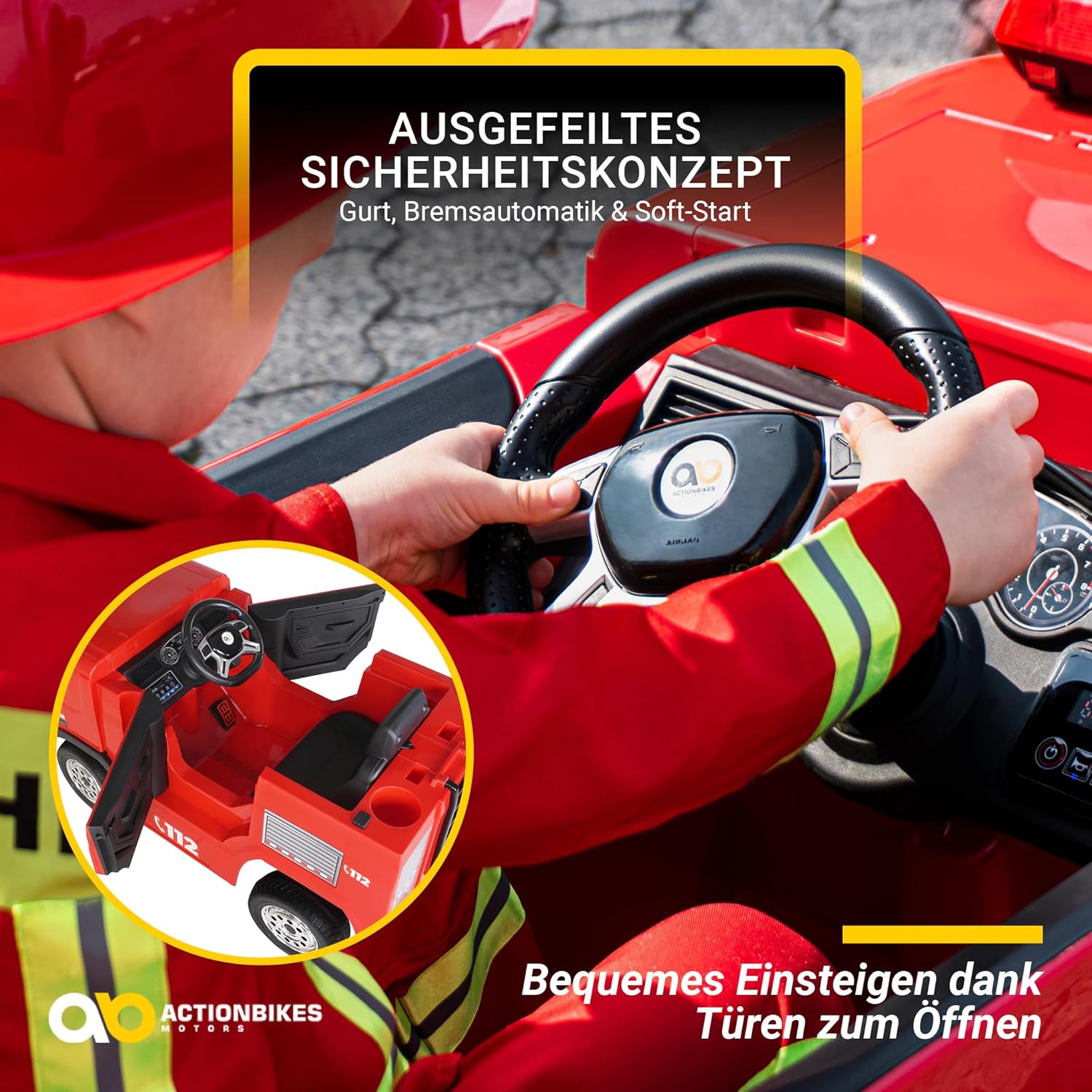 - ✔ Original Actionbikes Motors Feuerwehrauto SX1818 ✔ 2 Motoren 12V 35Watt (Total 70Watt) ✔ Ausdauernde 12 Volt 10 AH Batterie ✔ Climb-Funktion ✔ Geräumiger Innenraum