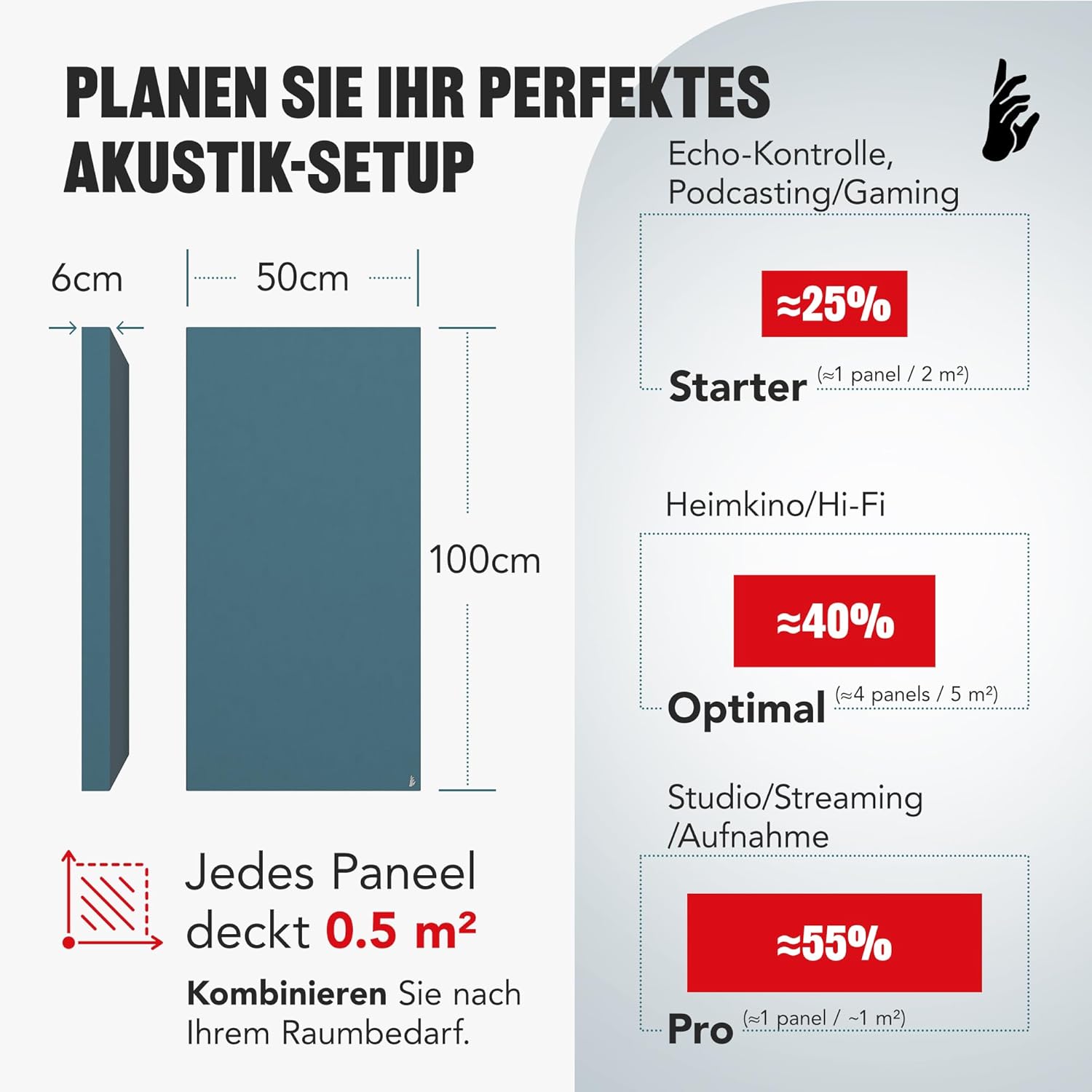 - NACHHALL SPÜRBAR REDUZIEREN – Dieser Schallabsorber senkt die Raumhallzeit deutlich – bis zu 85 % weniger Echo/Flatterhall. Klasse B Schallabsorption (EN ISO 11654) für klarere Sprache, präzisere Mixe und wirksame Schalldämmung.