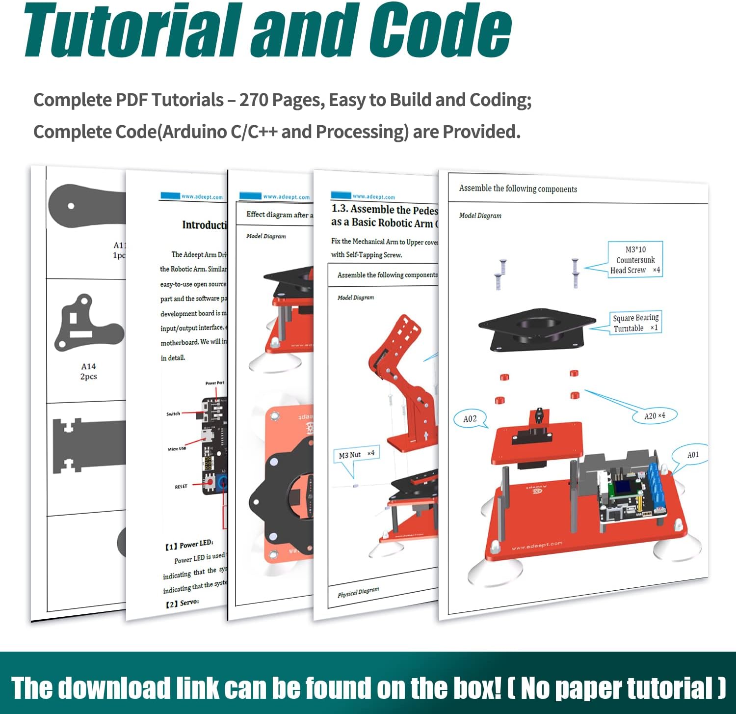 • Das 5-DOF-Roboterarm-Kit wurde für Roboterliebhaber entwickelt und ist mit Arduino IDE kompatibel. Ein detailliertes Handbuch (PDF) und eine Vielzahl interessanter Arduino-Code-Routinen werden bereitgestellt.