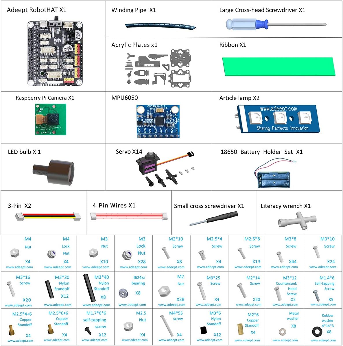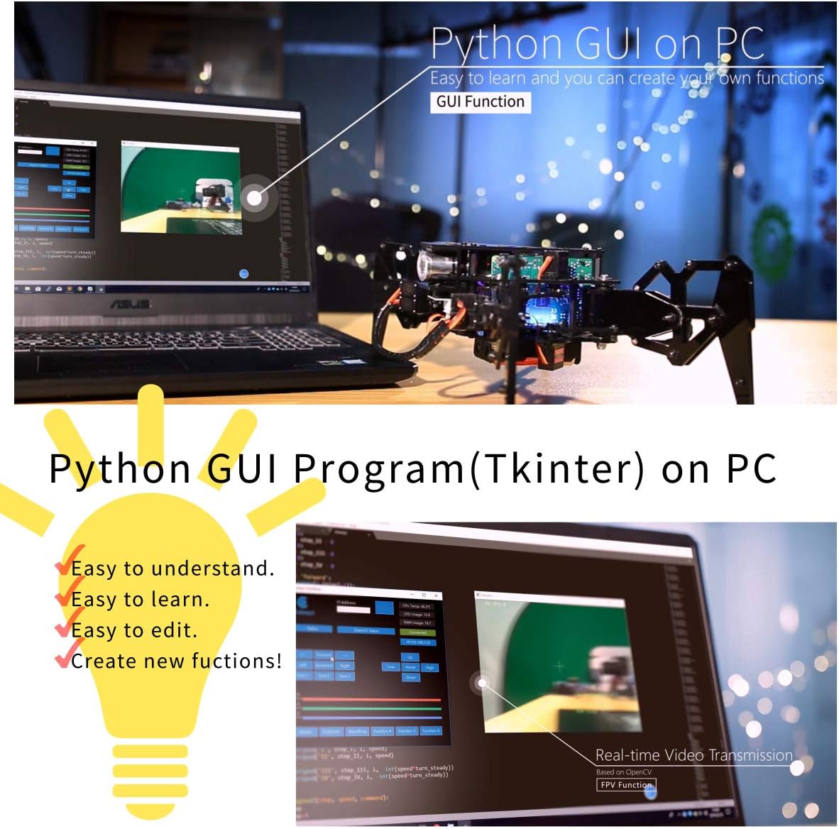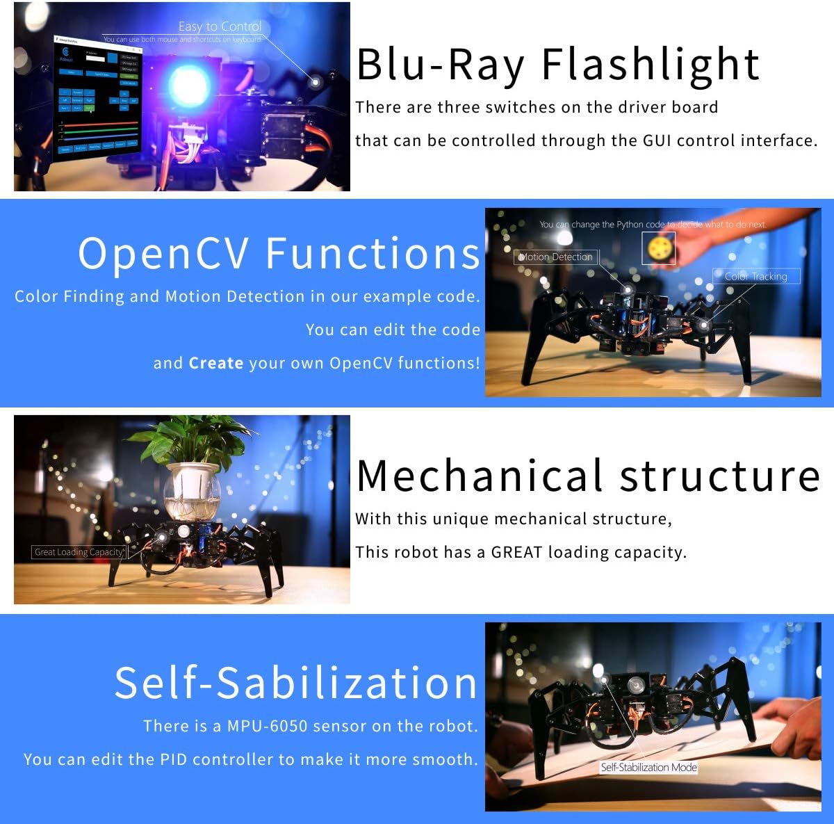 - STEAM Educational Robot - Ein komplettes Bionic Quadruped Spider Robot Kit basierend auf dem Raspberry Pi (Kompatibel mit RPi 4/3B/3B+, Raspberry Pi ist NICHT enthalten). Objekterkennung, Verfolgung, Bewegungserkennung - basierend auf openCV; C /