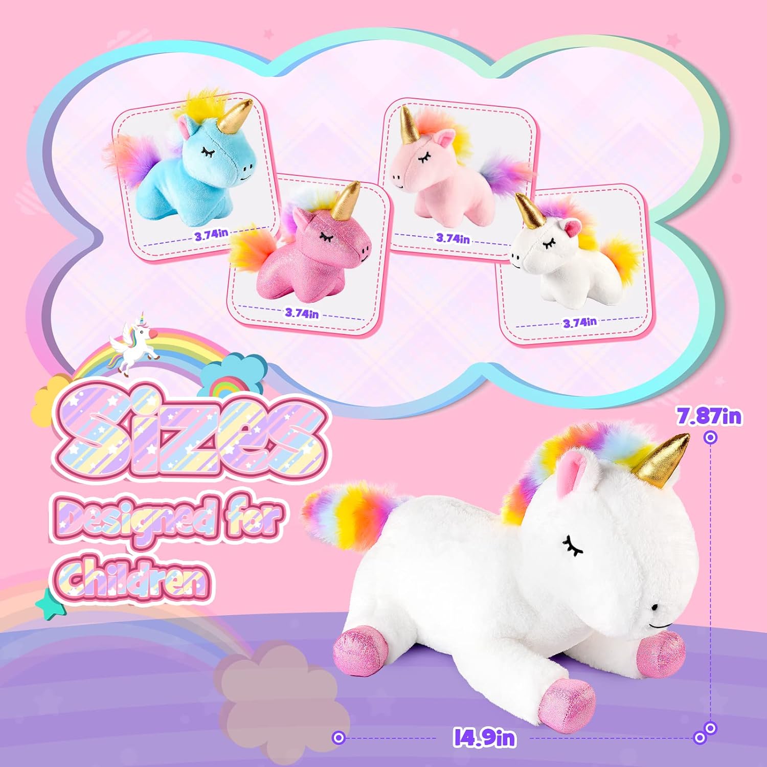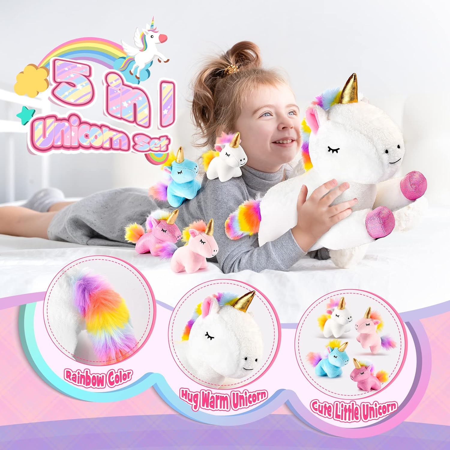 • 【Speziell für Kinder entworfen】: Die Länge der Einhorn-Mami ist 17.7 Zoll, die Länge der Einhorn-Babys ist 5.9 Zoll. Das einzigartige Kuscheltier Mama Einhorn kommt mit einer Überraschung in ihrem Bauch, 4-Mini Baby Einhörner, die durch die