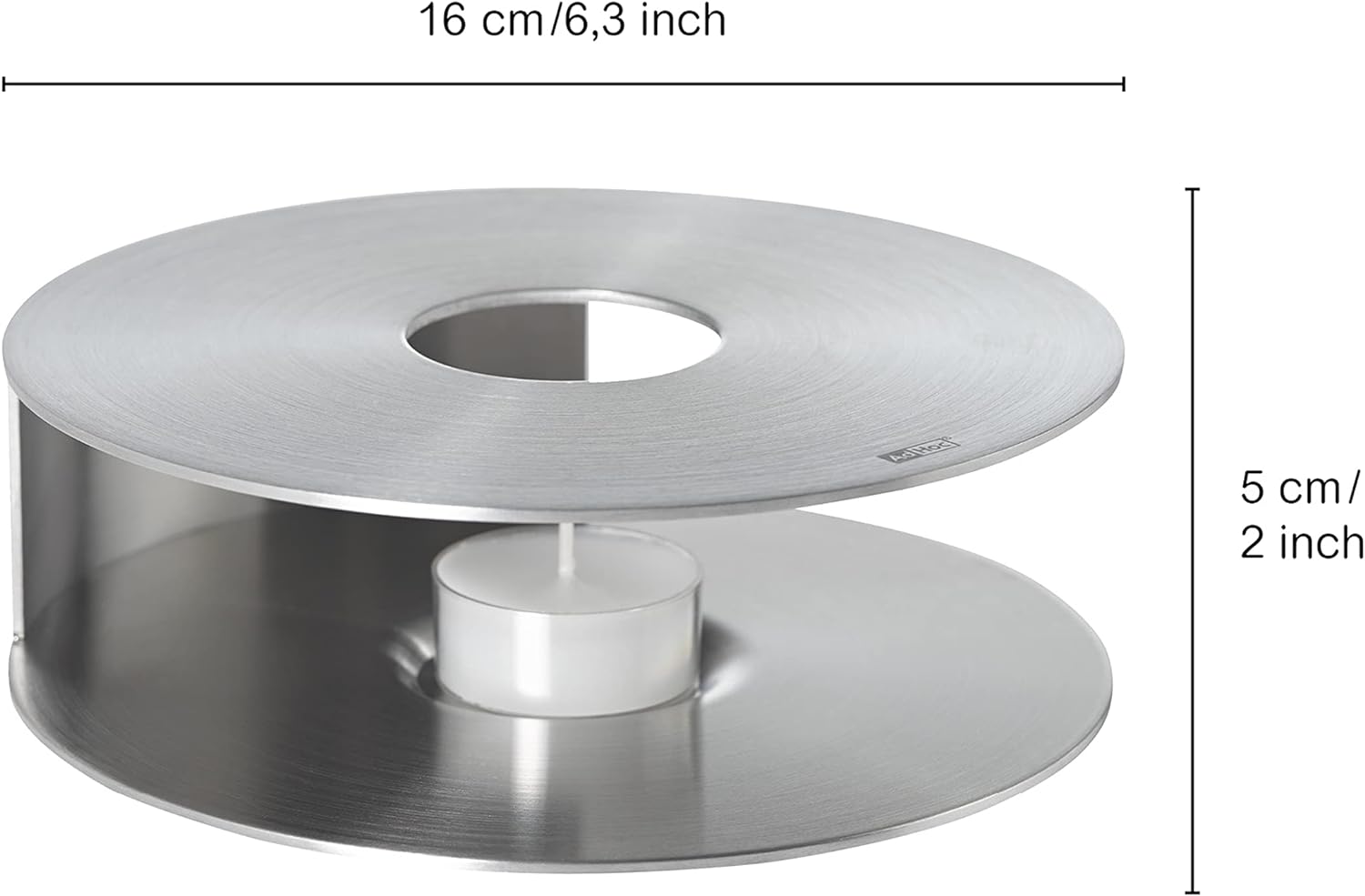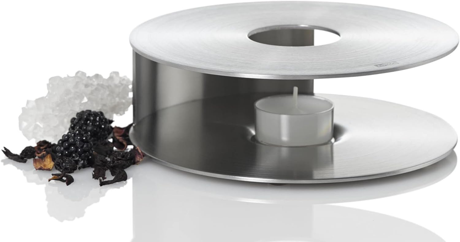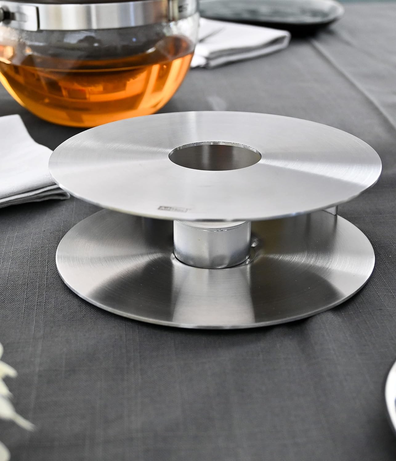 - Ein Teelicht gibt aus der unteren Ebene des Stövchens ausreichend Wärme in die zweite Ebene nach oben ab, dort verteilt sie sich dank des Edelstahls und der grossen Abstellfläche gleichmässig.
