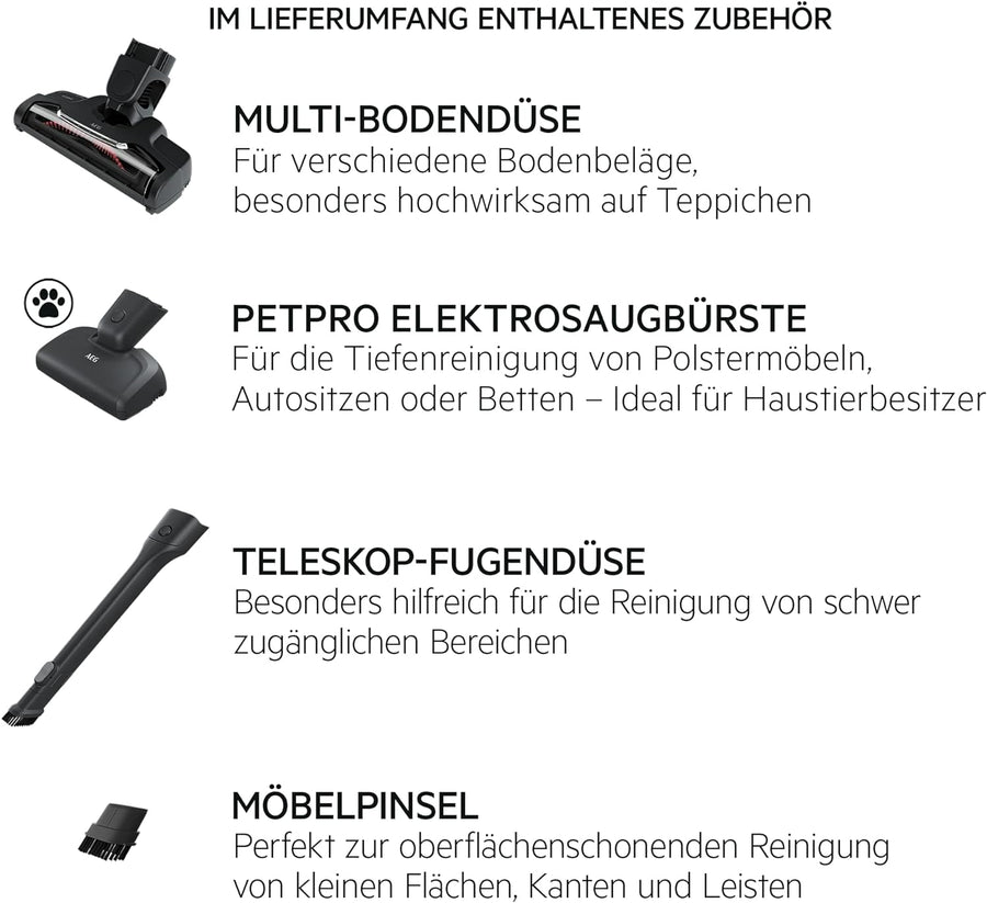 - Lieferumfang: 1x QX6, 1x integrierte Fugendüse und Möbelpinsel, 1x PetPro-Elektrosaugbürste, 1x Ladestation // Zubehör-Empfehlung: Erweiterungsset AKIT21, Power-Softrolle AZE137, Filter-Set ASKW1