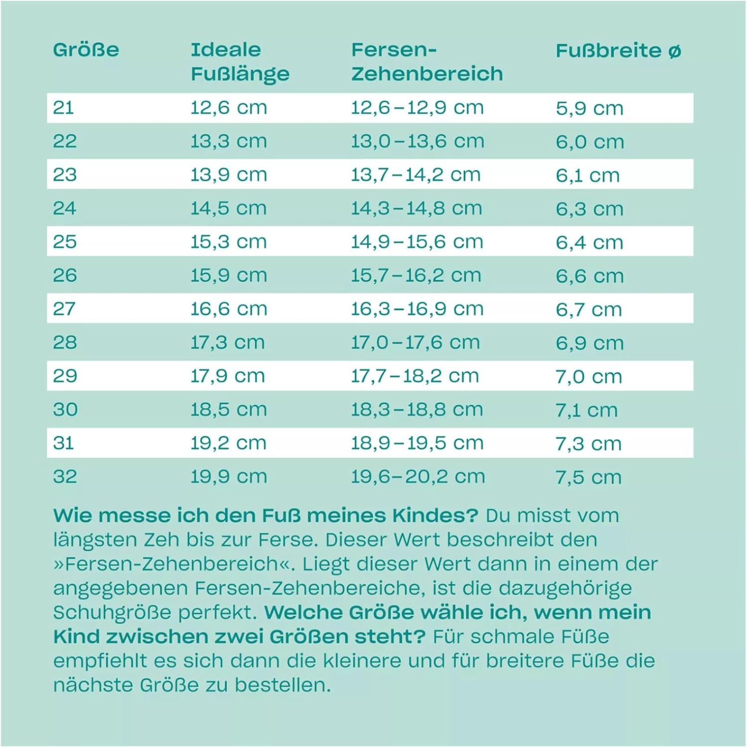 - Minimalschuhprinzip – Die dünne Sohle und die Naturform erhöhen den Tragekomfort. Die Zehen haben genügend Platz, sodass sie sich frei bewegen und entwickeln können.