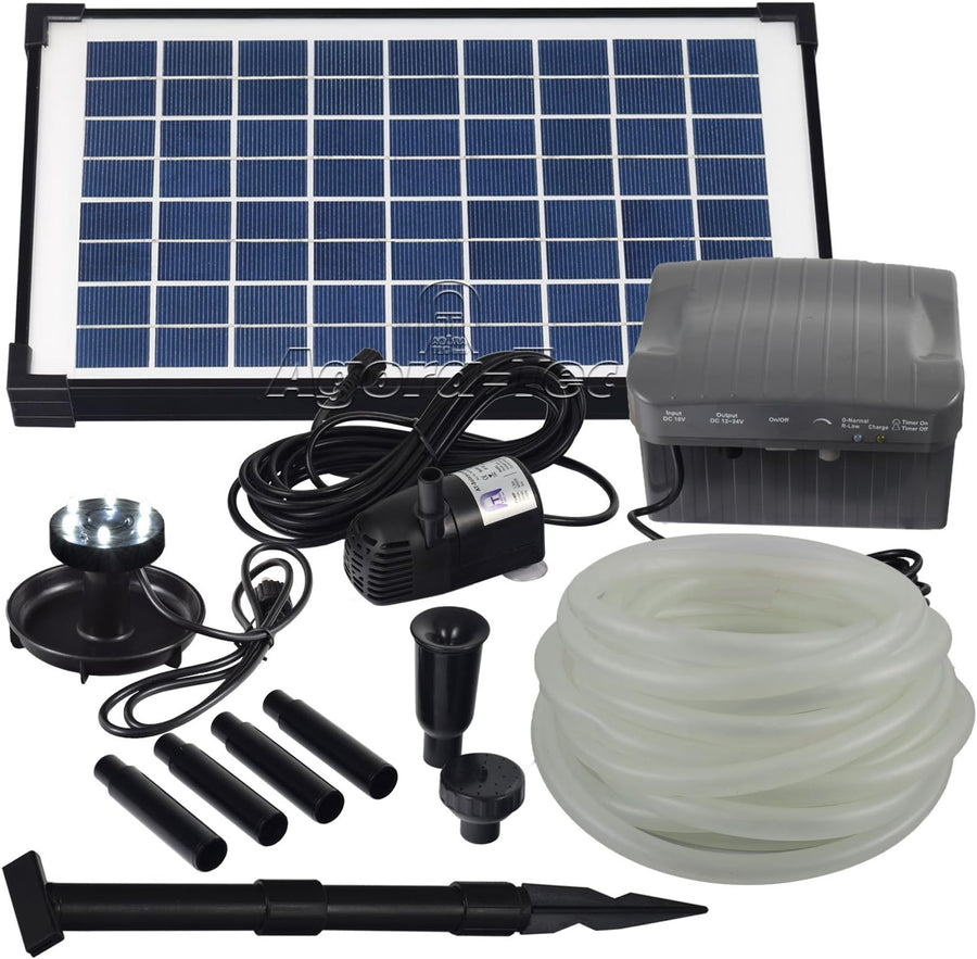 Agora-Tec® at-Solar Bachlaufpumpen - Set 10W-BLH mit Akku und 6- Fach LED Ring inklusive 9 Meter Bac