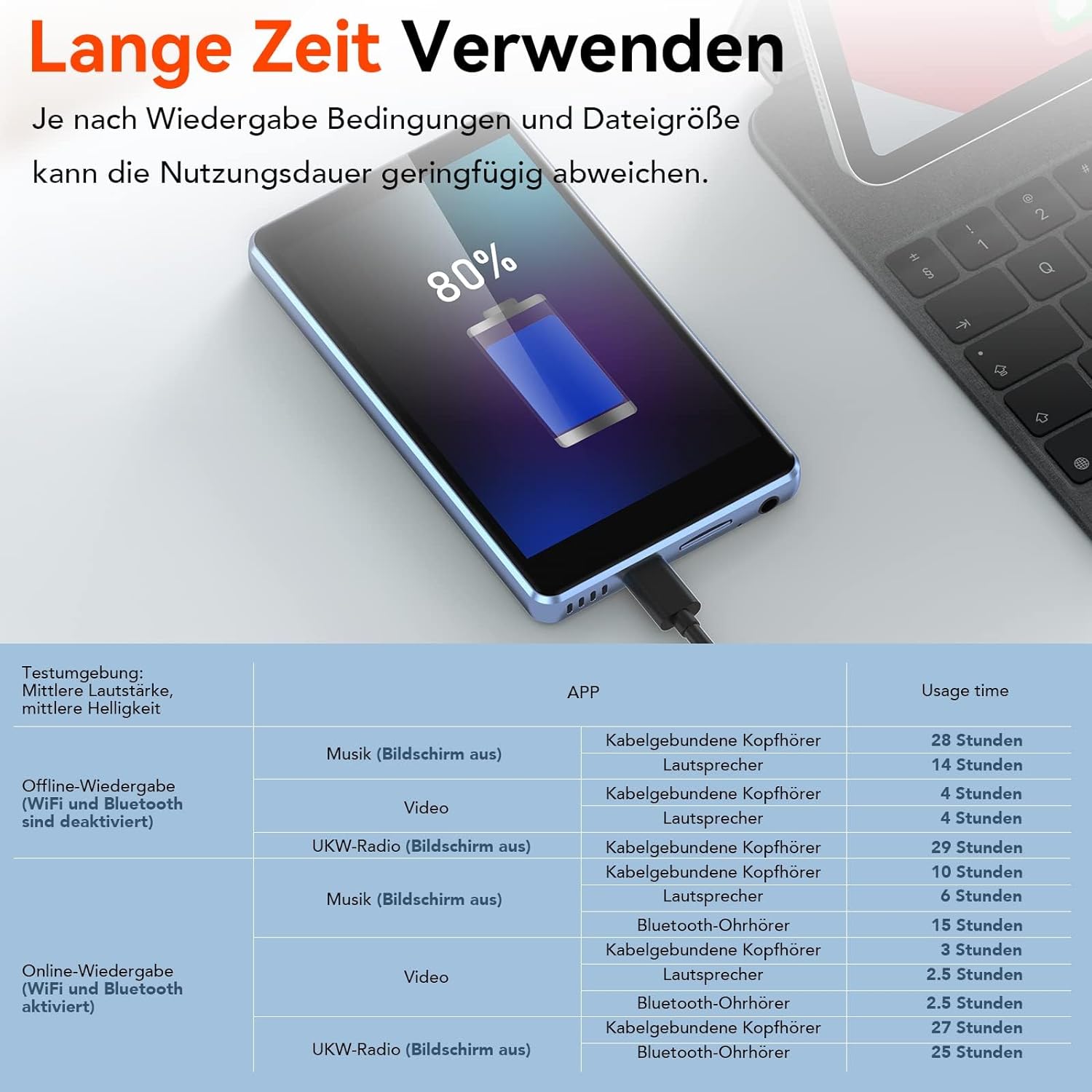 - 【5 MP Kamera & längere Akkulaufzeit】 MP3-Player ist nicht mehr auf Musik beschränkt, so dass Sie schöne Momente aufnehmen können, während Sie draussen trainieren. Und es ist ein eingebauter 1200-mAh-Akku mit USB-C-Ladeanschluss. 2 Stunden volle