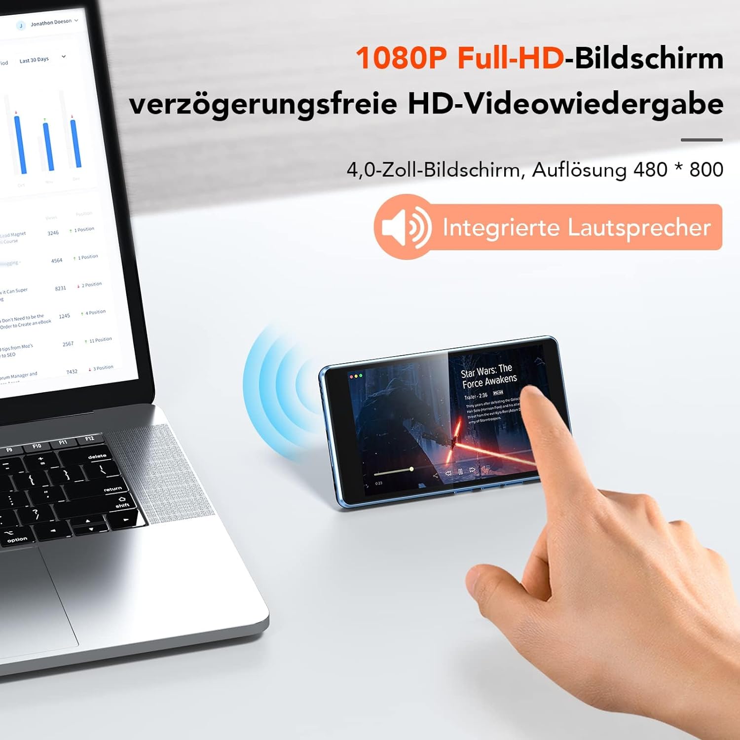 - 【4 Zoll HD Full Touch Screen】 4 Zoll hochauflösender (480 * 800) Full-Touchscreen bietet eine einfachere Bedienung und interaktive Erfahrung. Dieser MP4-Player kann 1080p hochauflösende Videos reibungslos abspielen. Es ist kompatibel mit
