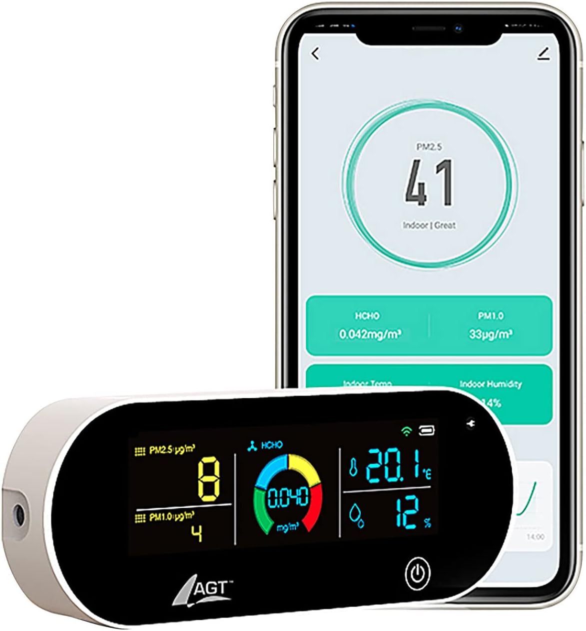 AGT Raumluftmessgerät: 5in1-Akku-Luftqualitätsmesser, HCHO, PM1/2,5, Temperatur u.v.m., App (Partike