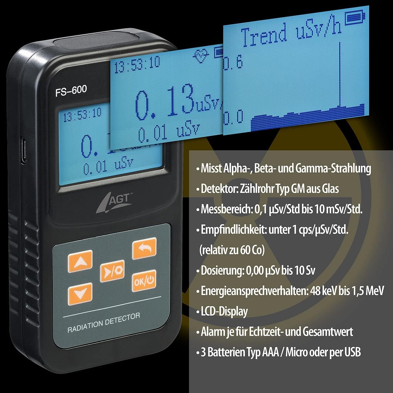 - Digitaler Geigerzähler und Dosimeter • Messbereich: 0,1 µSv/Std bis 10 mSv/Std. • Energieansprechverhalten: 48 keV bis 1,5 MeV • Stromversorgung: 3 Batterien Typ AAA / Micro oder per USB (Batterien und/oder USB-Netzteil bitte dazu bestellen)