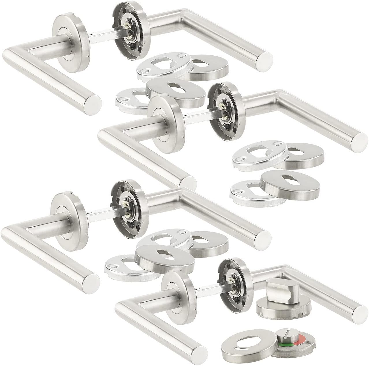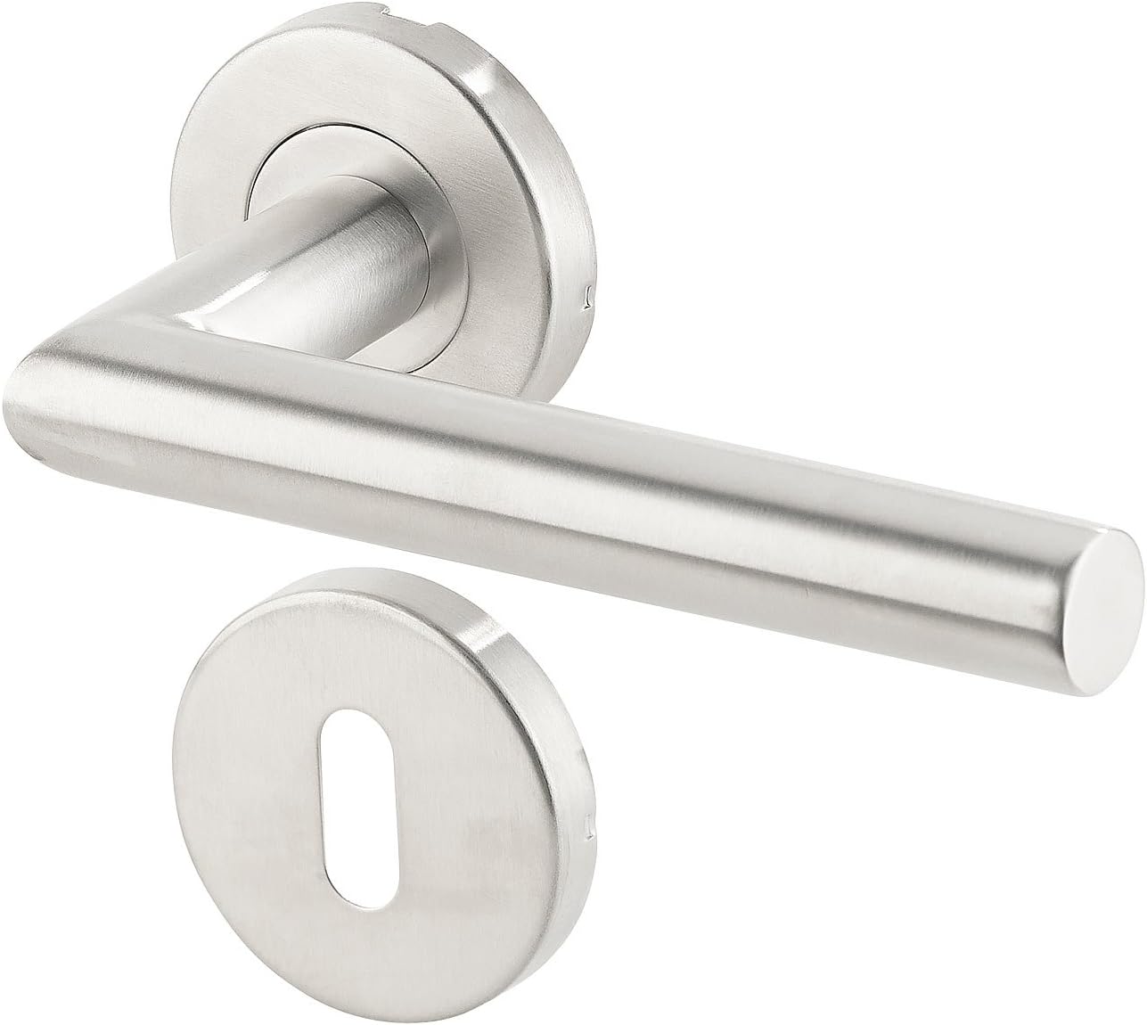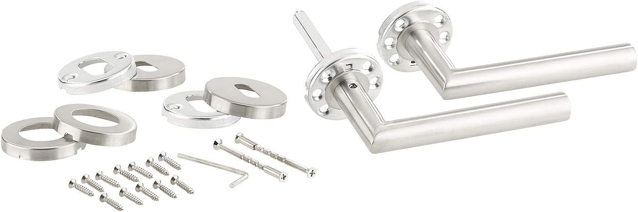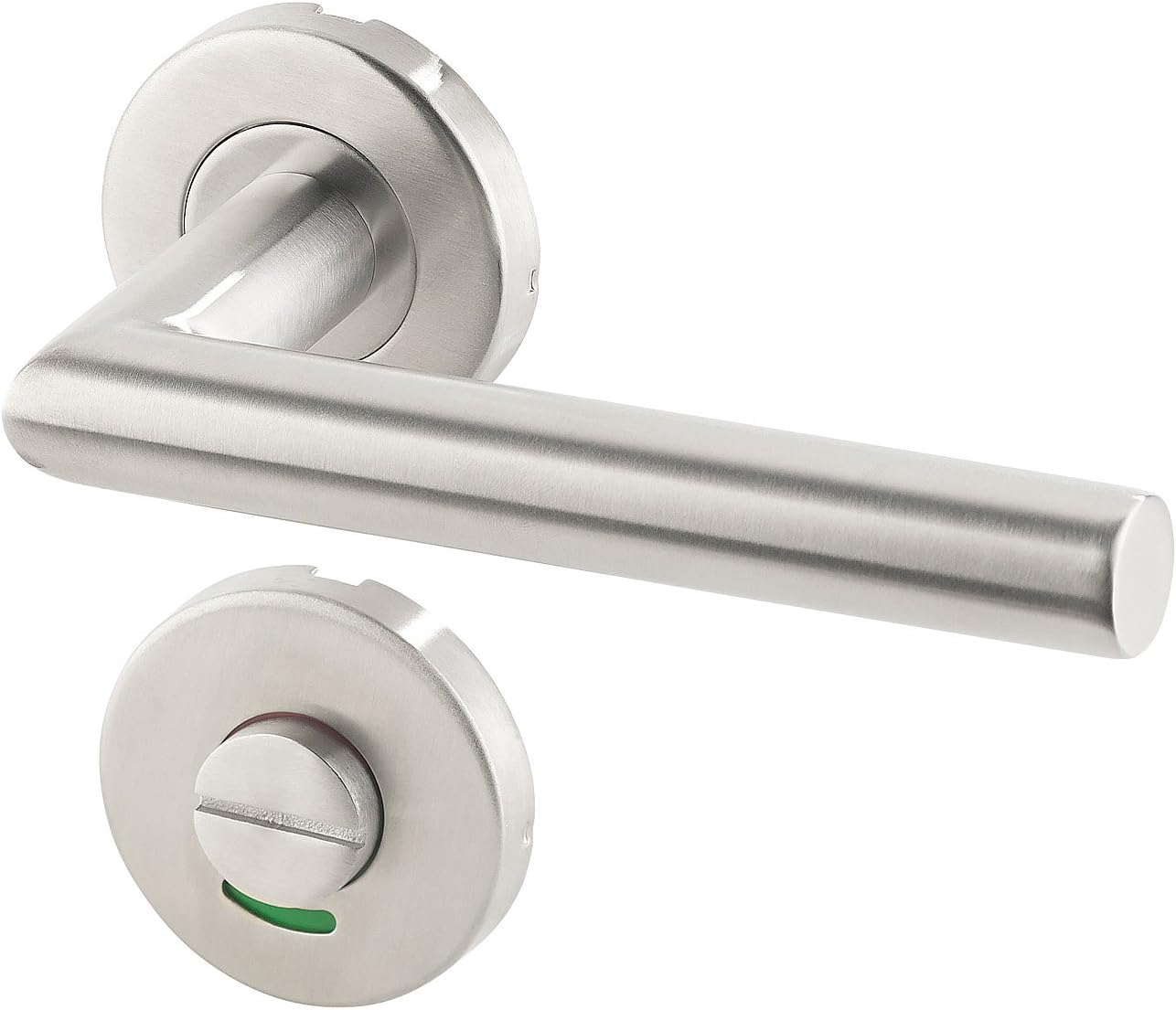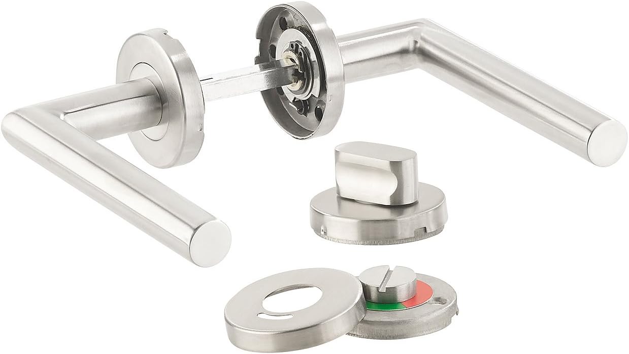 - Rostfreier Edelstahl mit matter Oberfläche • Für alle gängigen Zimmertüren geeignet • Edelstahl-Türbeschlag mit runder Rosettengarnitur für Toiletten-Türen • Stabile Hochhalte-Feder: automatischer waagerechter Sitz der Drücker • Für alle