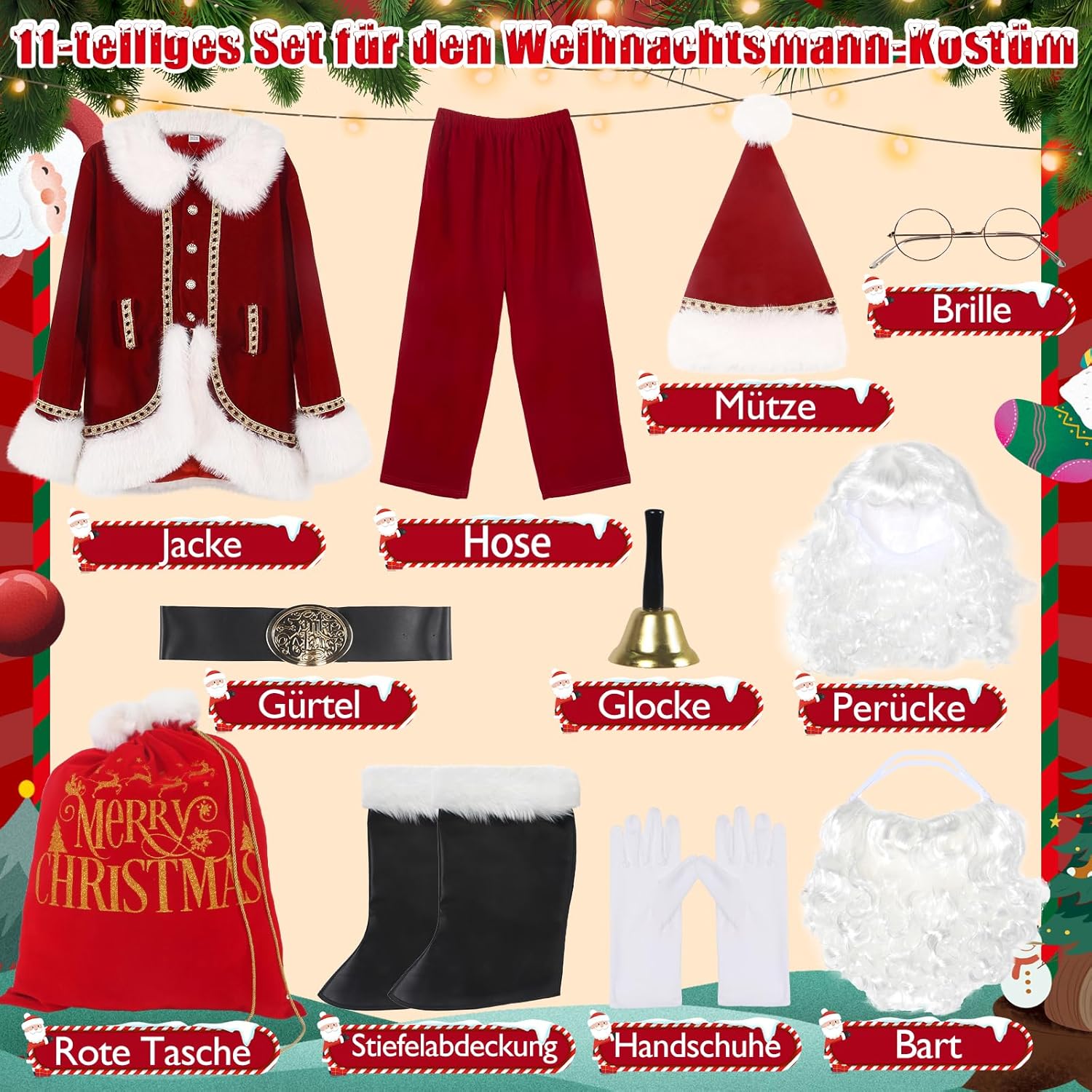 - 11 PCS Santa Outfit: Unser komplettes realistisches Weihnachtskostüm für grosse und grosse erwachsene Männer beinhaltet rotes Vintage-Flock-Knopfjacke mit Plüschpelzbesatz + elastische Taille Hose mit Tasche + schwarzer Gürtel mit Gold geprägtem