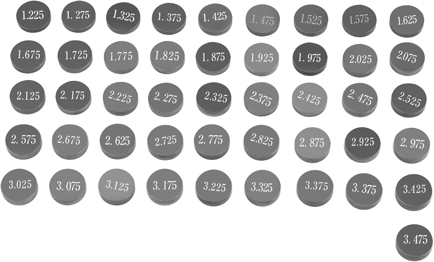 - 46 x ventil shim, Durchmesser : 7.48 mm, Dicke : von 1,225 mm bis 3,475 mm in Schritten von 0,05 mm;