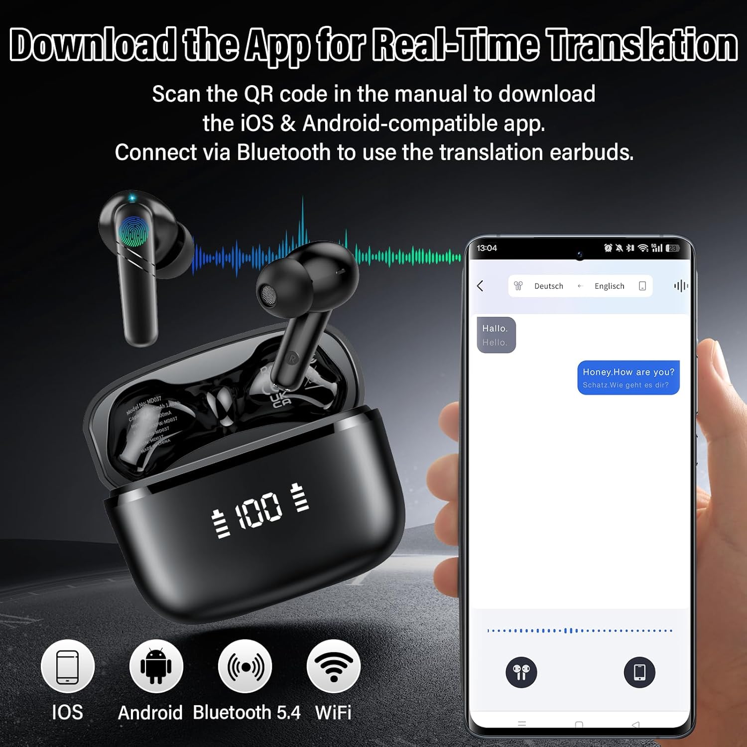- Bluetooth 5.4 und App-Entsperrung: Diese Übersetzer Ohrhörer verwenden Bluetooth 5.4 für eine schnelle, stabile Verbindung mit grosser Reichweite – ideal für Reisen und mehrsprachige Kommunikation. Die verbesserte Signalstabilität steigert die