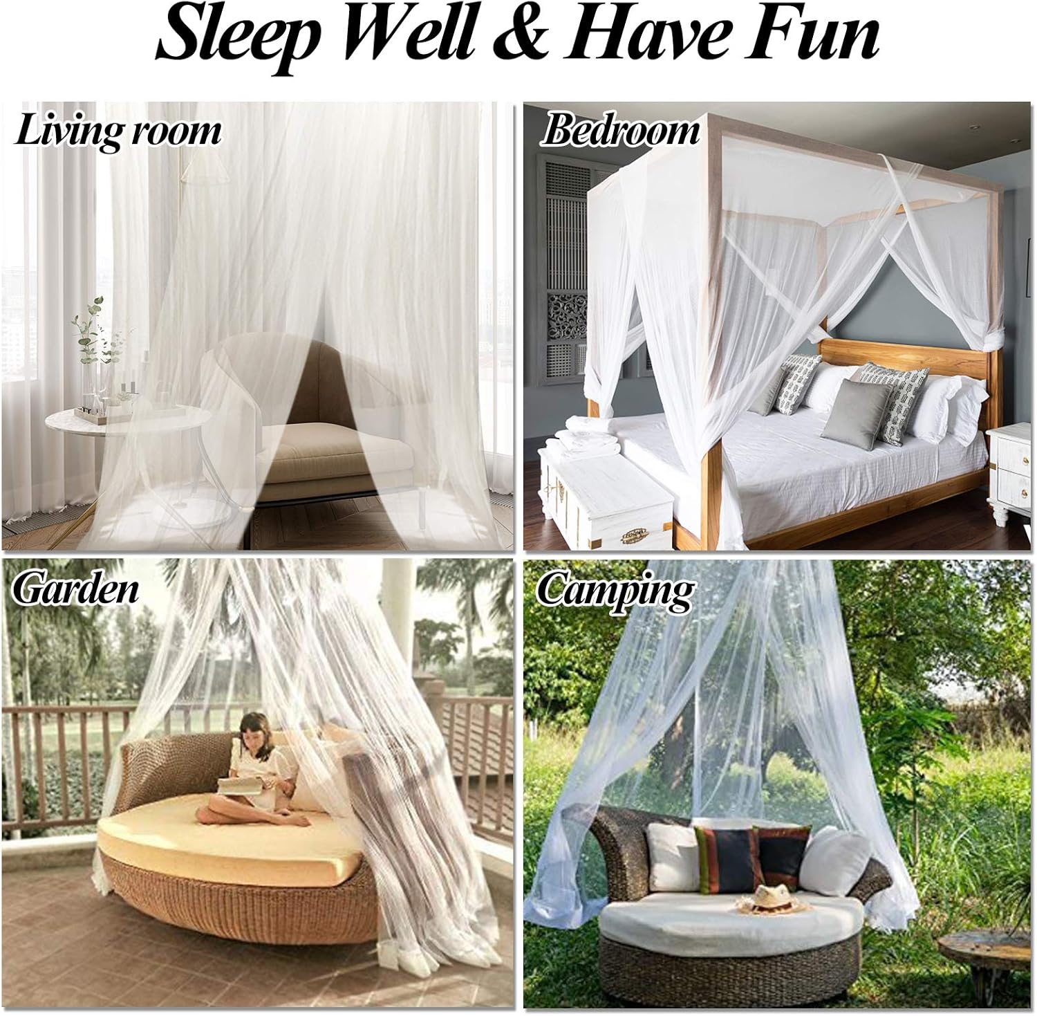 - Der Betthimmel für 4 Ecken besteht aus hochwertigem Polyester-Mesh-Gewebe, weich und leicht. Es sorgt für eine gute Luftzirkulation, sodass Sie einen ruhigen und entspannten Schlaf haben.