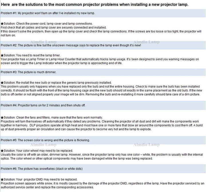 - Aimdio ist Seit über 10 Jahren auf Projektorlampen Spezialisiert, Professionell, Verantwortungsbewusst und Zuverlässig. Freundlicher und Schneller Kundenservice, Bitte Kontaktieren Sie uns per E-Mail Oder Kundenservice, Wenn Sie Fragen oder Bedenken