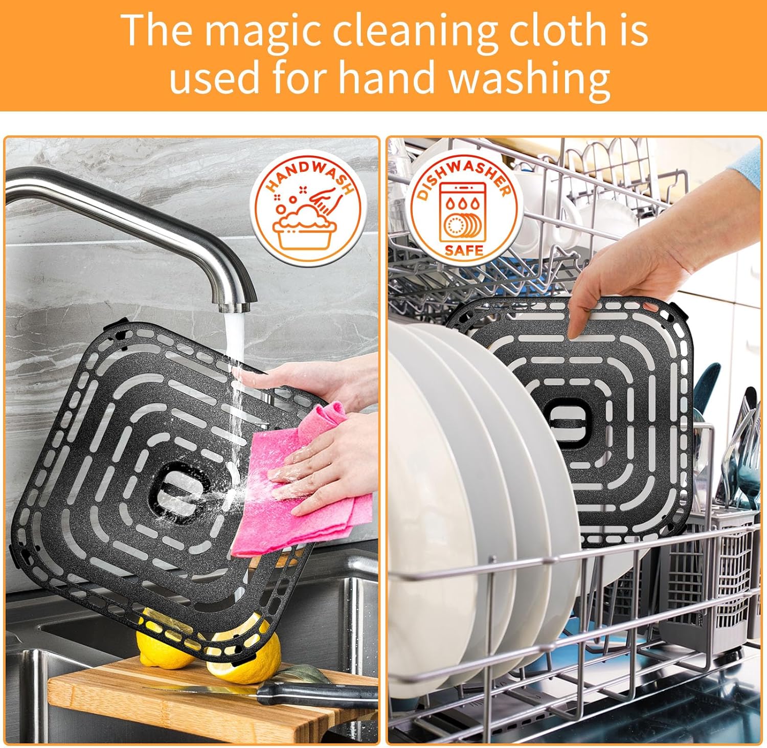 - Lieferumfang: 1 x Luftfritteusen-Grillplatte, 1 x magisches Reinigungstuch, 4 x Luftfritteusen-Gummi-Stossdämpfer. Hinweis: Bitte messen Sie die Grösse Ihrer Luftfritteuse, bevor Sie eine Bestellung aufgeben.