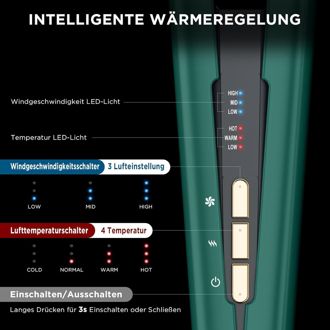- Ohne Heizplatten, ohne Hitzeschäden - Der innovative Air-Haarglätter verwendet präzise gerichtete, erwärmte Luftströme, um das Haar effizient zu glätten. Anders als herkömmliche Glätteisen, die hohe Temperaturen nutzen, um Feuchtigkeit zu