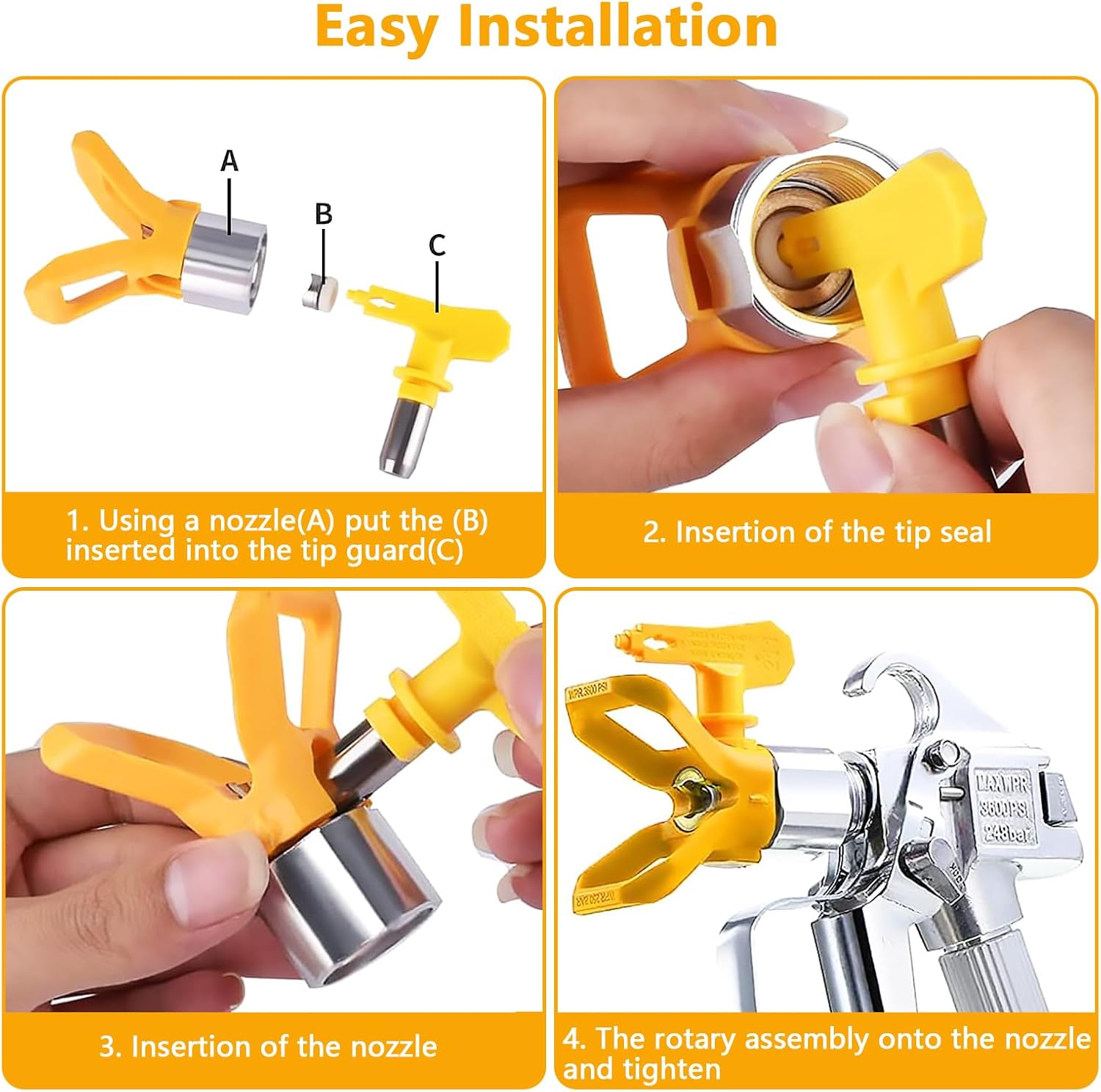 - Einfach zu bedienen: Diese reversible Airless Farbspritzdüsenspitze ist einfach zu bedienen, führen Sie zuerst die Düsendichtung Spitzendichtung in den Schutzsitz ein, dann setzen Sie die Düse in den Schutzsitz ein und drehen Sie, um sie zu fixieren,