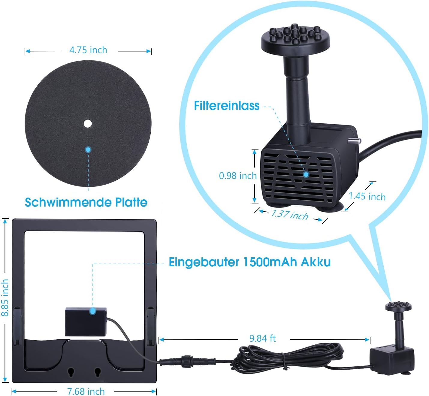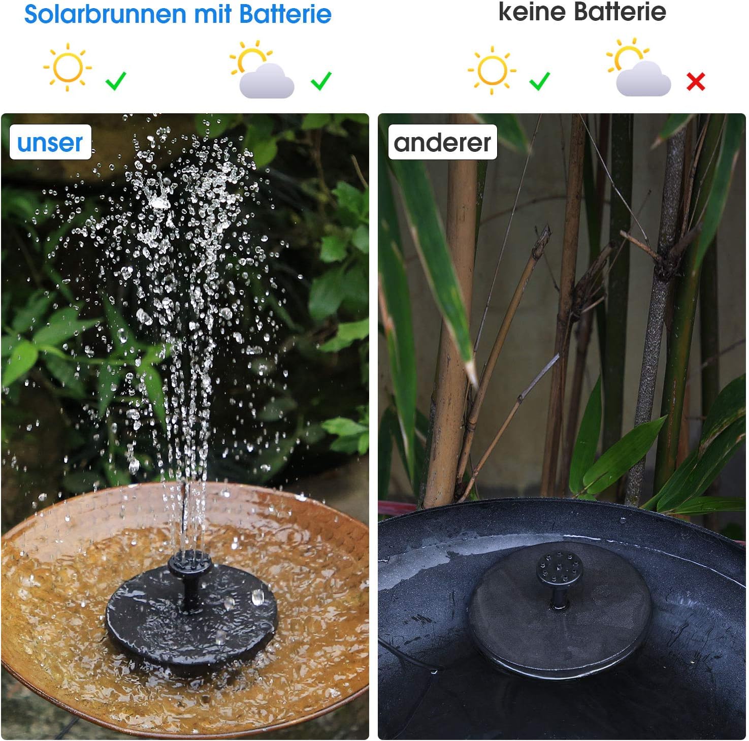 - ☀【Umweltfreundliche Batterie】: Diese Solar-Schwimmbrunnen Wasserpumpe eingebaute Batterie, automatische Speicherung von Sonnenenergie, echte grüne Solarwasserpumpe. Es nutzt die Sonnenenergiequelle voll aus, es wird noch für 2.5 Stunde nach Einbruch der Dunkelheit verwendet, was sehr ist umweltfreundlich.