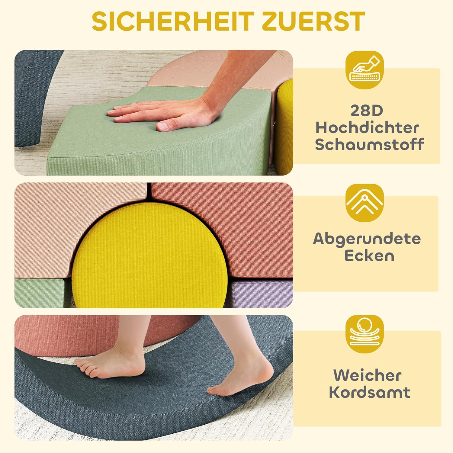 - Stabile Unterstützung: Der Kern aus 28D hochdichtem Schaumstoff schützt Ihr Kind und behält selbst bei intensivem Spielen seine Form. Umhüllt mit weichem Cord, bietet es eine warme, ansprechende Oberfläche und schafft eine sichere, gemütliche