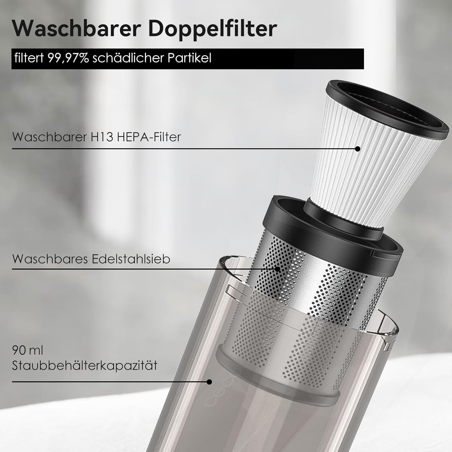 - HEPA-Filter & Edelstahl-Mesh: Der waschbare HEPA-Filter und das Edelstahl-Sieb fangen Allergene und Feinstaub sicher ein. Einfaches Ausspülen der Filter für langanhaltende, allergikerfreundliche Leistung.