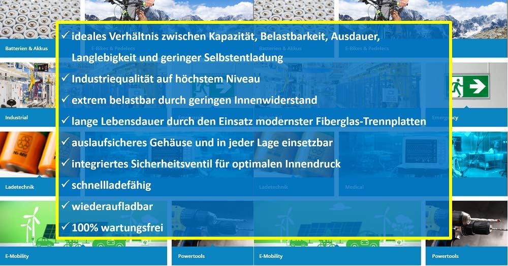 - Anwendungsbereiche: Not- und Sicherheitsbeleuchtung Brandmeldetechnik Alarmtechnik Industrie USV-Anlagen IT/ Telekommunikation Radar Funk Sicherheitsbeleuchtung BSV-Anlagen Notbeleuchtung Windkraftanlagen (Pitchverstellung, Steuer-/Regelungstechnik,