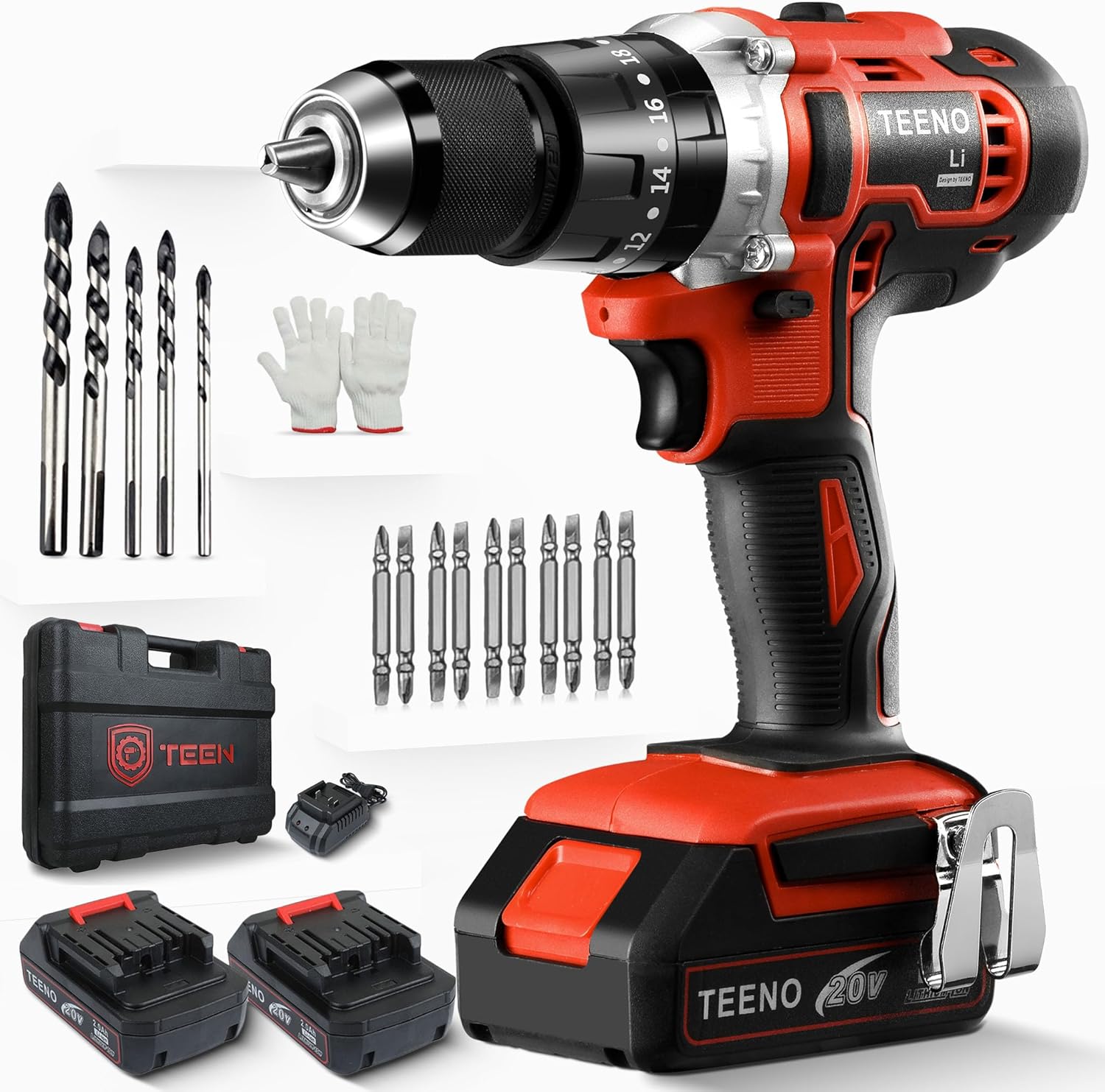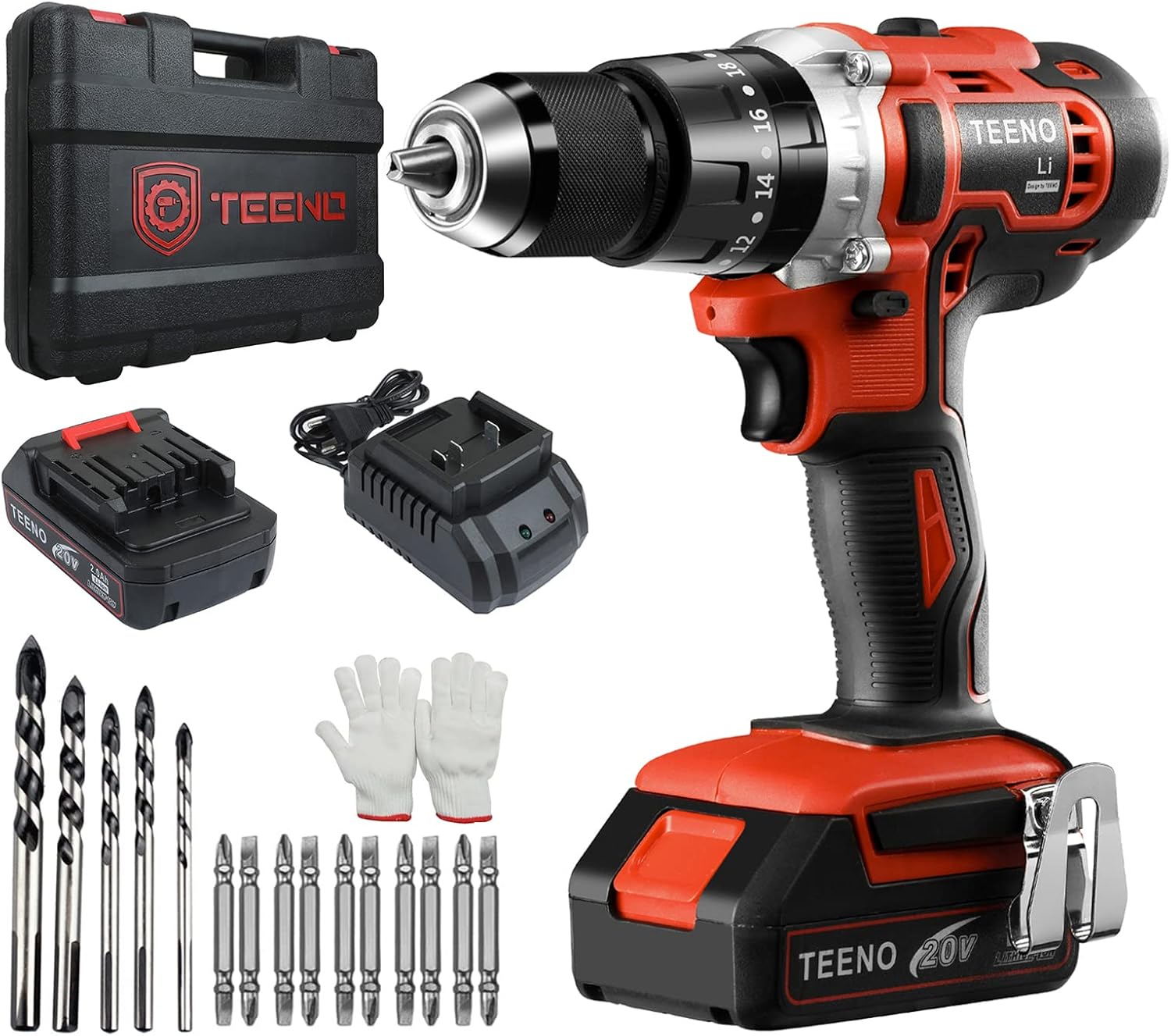 - [Lieferumfang: 1 x Akkubohrer 20 V, 5 x Aufsätze, 10 x Schraubspitzen, 2 x 2000 mAh, 1 x Ladegerät, 1 x Handschuh, 1 x Kunststoffbox, 1 x Bedienungsanleitung (evtl. nicht in deutscher Sprache)