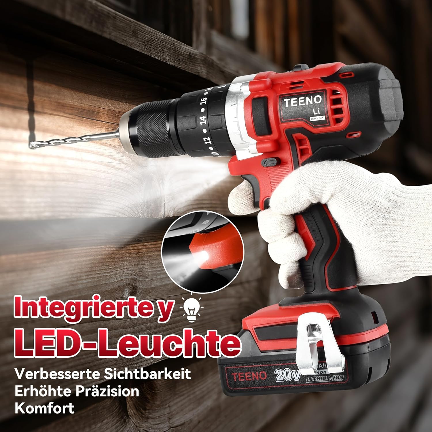 - [ERGONOMISCHES DESIGN] - Dieser Bohrschrauber verfügt über ein integriertes LED-Licht für eine optimale Ausleuchtung der Arbeitsbereiche im Dunkeln; die Kontrollleuchte zeigt die Tragfähigkeit des Akkus an; der rutschfeste Griff ist aus weichem