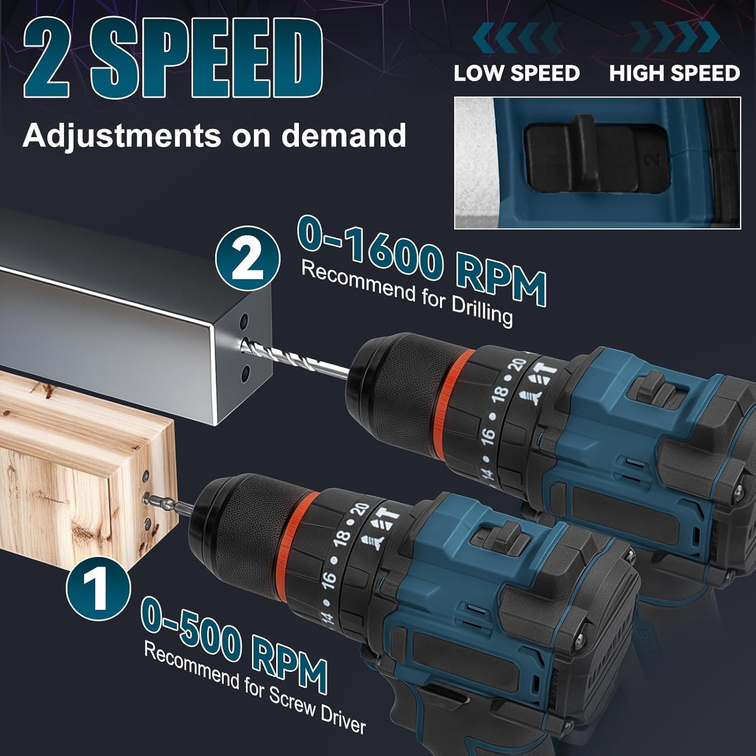 - Hocheffizienter Bürstenloser Motor: Schlagbohrschrauber nimmt hocheffiziente bürstenlose Motoren an, der Betrieb wird stabiler und stabiler. 2-Gang-Getriebe, Stufenlose Drehzahlregelung, Geschwindigkeit (0-500 U/min), Drahtlose Geschwindigkeitsregelung