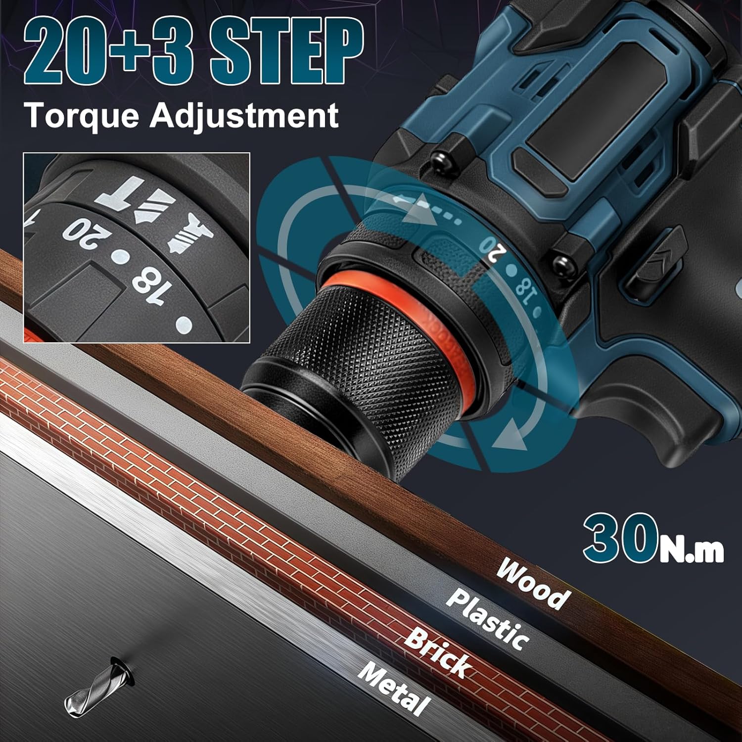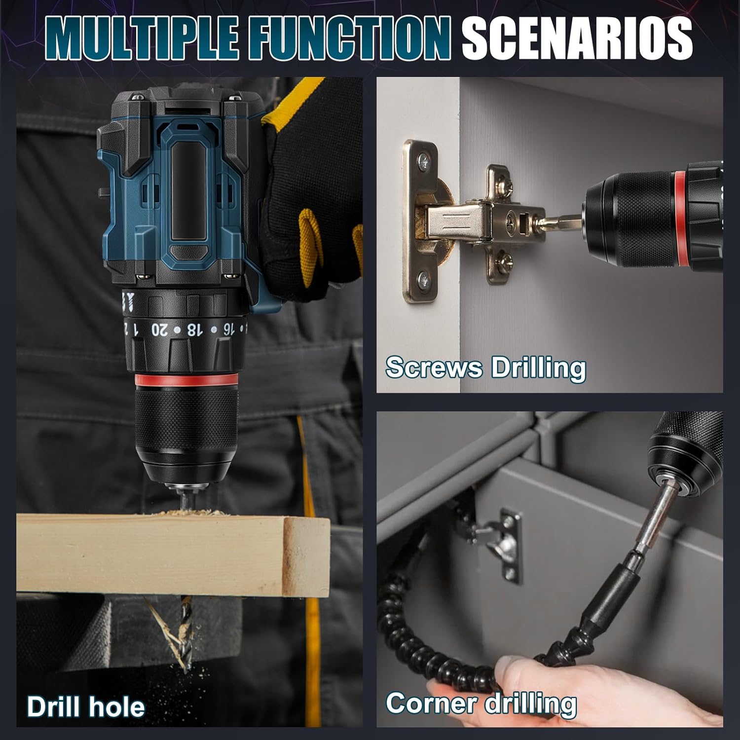 - 3-in-1 Arbeitsmodus: Kann als Schraubendreher, Akkuschrauber und Schlagbohrmaschine, Die Drehrichtung des Bohrers kann flexibel zwischen Rechts- und Linkslauf umgeschaltet werde, kommt mit Leuchten erhellen die Dunkelheit, und Schraubenaufgaben in Holz,