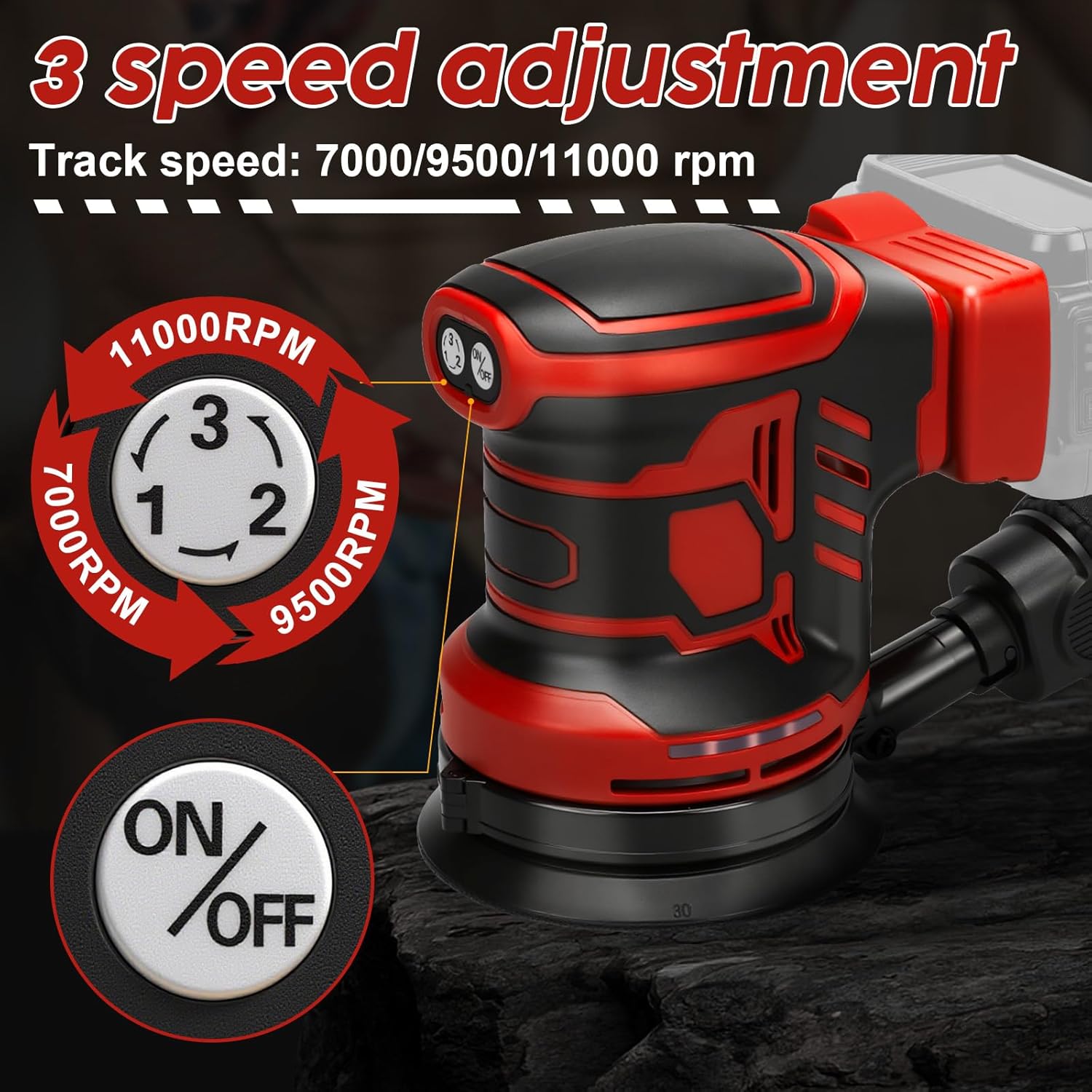 - Präzisionssteuerung: Dieser Exzenterschleifer ist mit einem fortschrittlichen Steuerungssystem ausgestattet, das die Drehzahl der Schleifscheibe präzise regeln kann. Er verfügt über 3 verschiedene Drehzahlen, die im Bereich von 7000/9500/11000 U/min