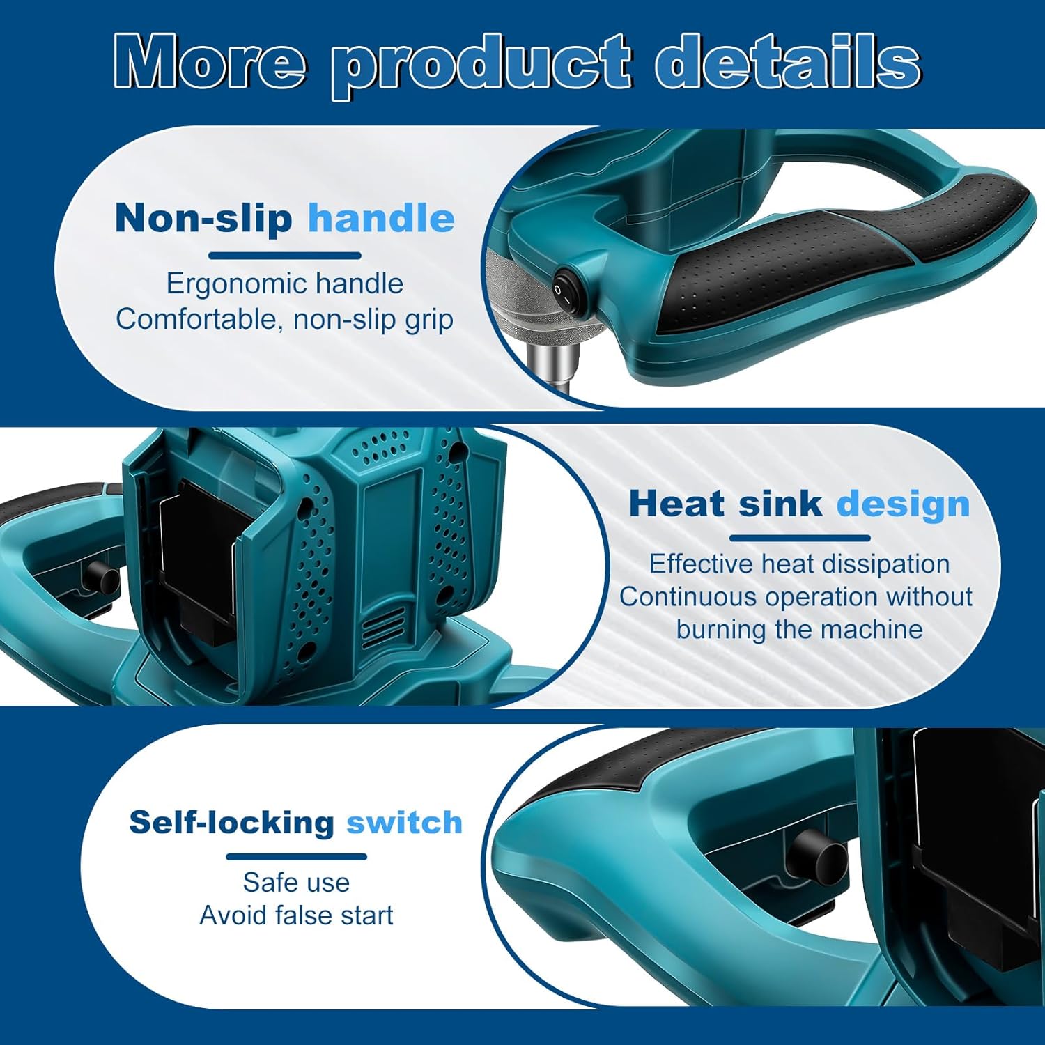 • Verriegelungsfunktion und Belüftungssystem: Bei der Arbeit für eine lange Zeit, drücken Sie die Sperre Schalter auf dem Mixer für den Dauerbetrieb, keine Notwendigkeit zu drücken und halten Sie den Auslöser beim Mischen, reduzieren die Arbeitskraft