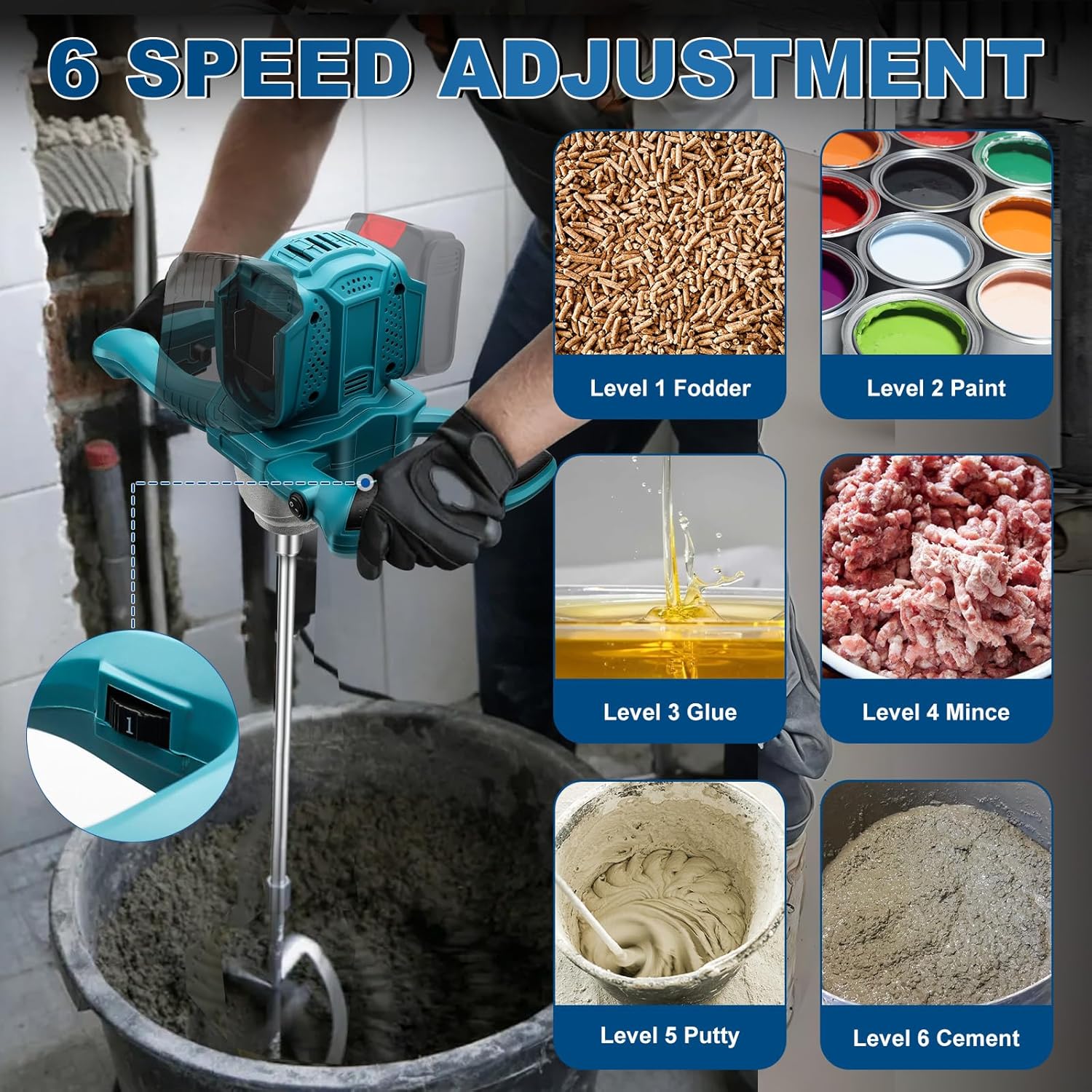 • Breites Einsatzspektrum: Die leistungsstarke Leistung und das tragbare Design dieses Elektromixers eignen sich ideal für den Einsatz mit Materialien wie Zement, Beton, Fugenmörtel, Schlamm, Farbe, Mörtel, Putz, Kitt, Fleischfüllung und anderen