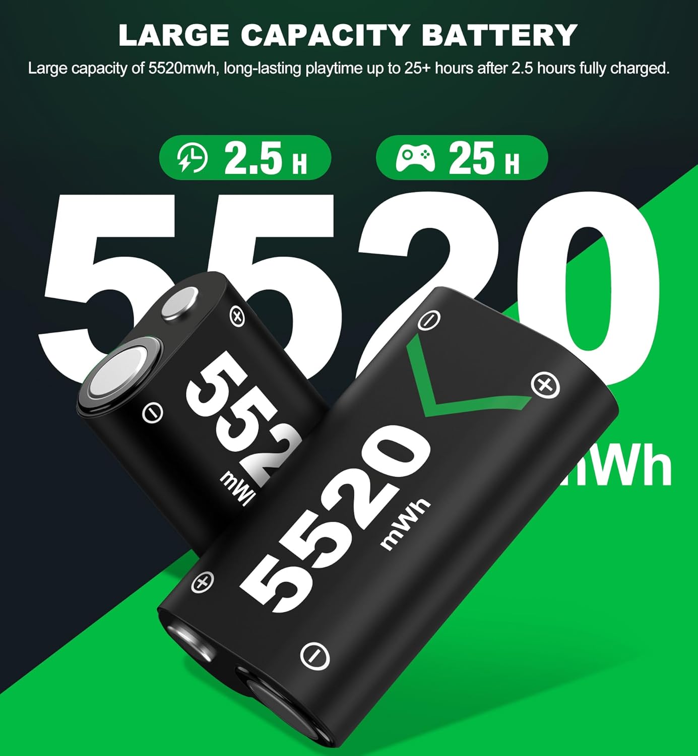 - Hoher Kapazitätt & Längerer Spieldauer: Dieser 5520mWh Akku für Xbox One Xbox Series X/Xbox Series S Wireless Controller kann etwa 2000 Mal aufgeladen werden, was umweltfreundlich ist und Ihnen hilft, Geld zu sparen. Es dauert etwa 2,5 Stunden, um