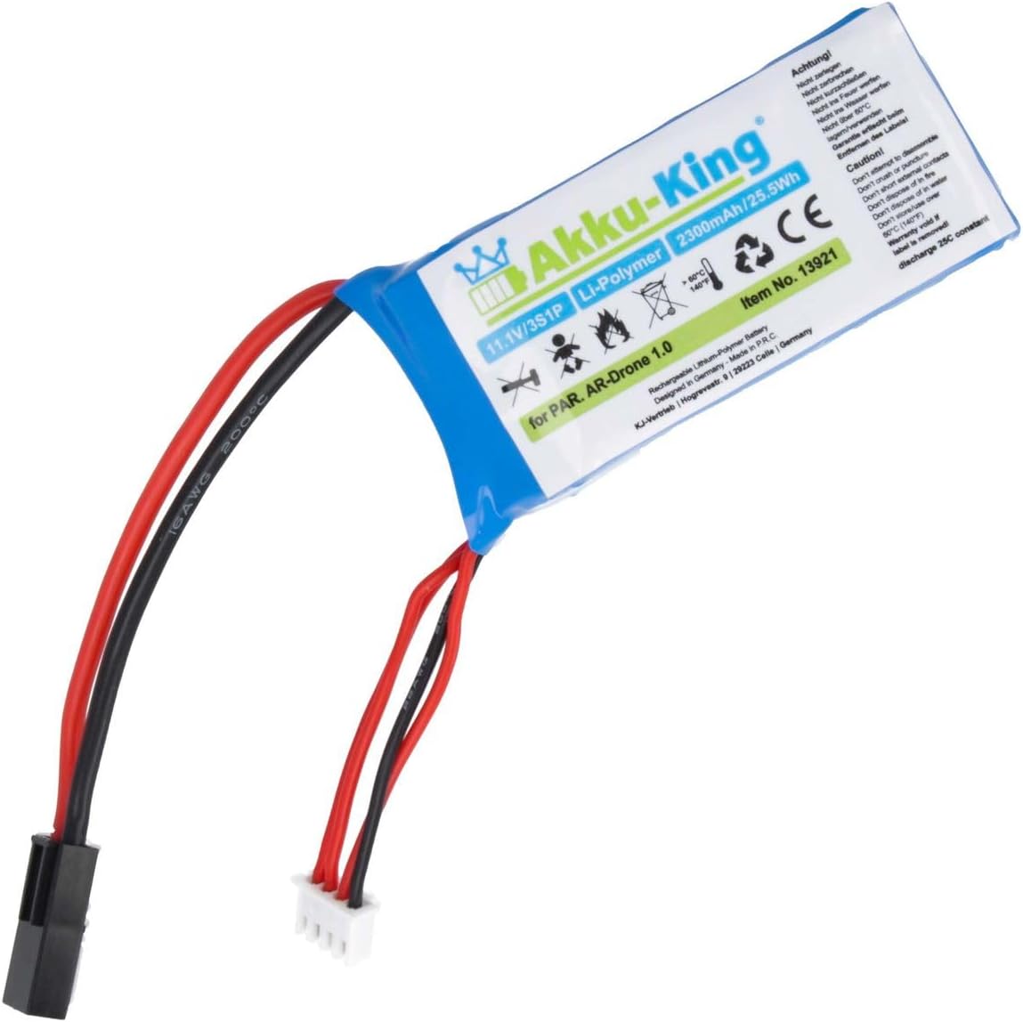- Technische Daten: Kapazität: 2300 mAh / 25.5 Wh | Spannung: 11.1 V | Typ: Li-Polymer | Masse: ca. 70 x 34 x 30 mm | Gewicht: ca. 164 g | Flugzeit: bis zu 25 Min | Entladewert: 20C