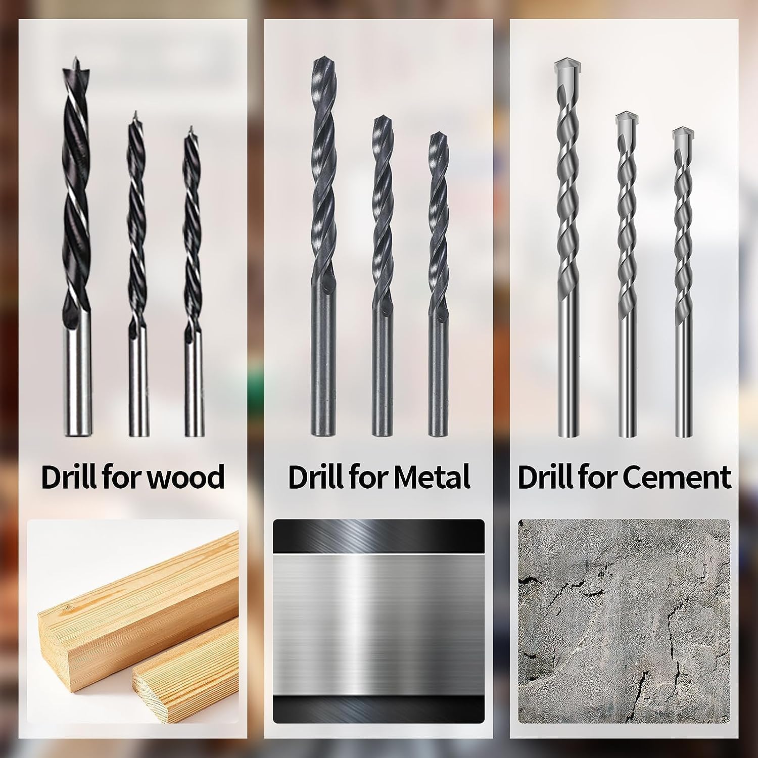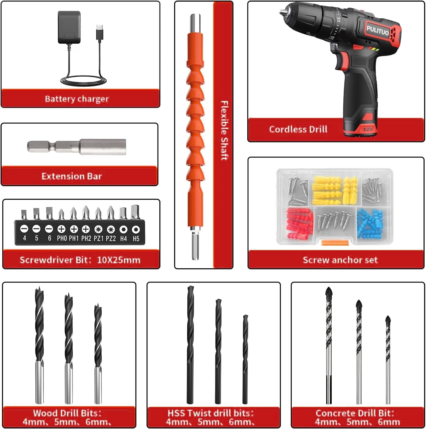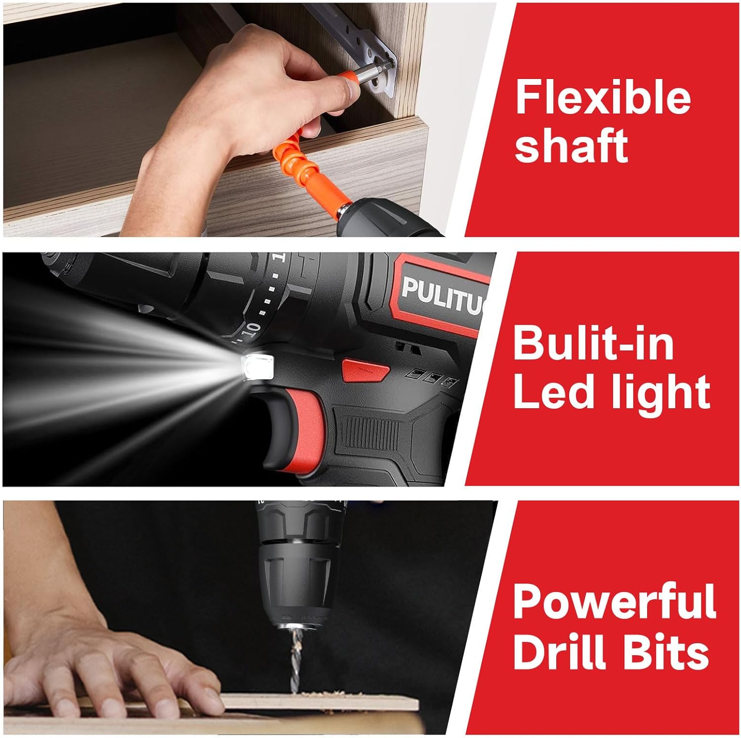 - [Schlagbohrschrauber Set] Der PULITUO-Bohrschrauber mit verschiedenen Schrauben kann verschiedene Materialien verwenden. Solcher Beton hämmert uns, bohrt Holz, Metall, Kunststoff und andere Schraubenzieher