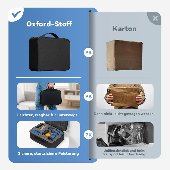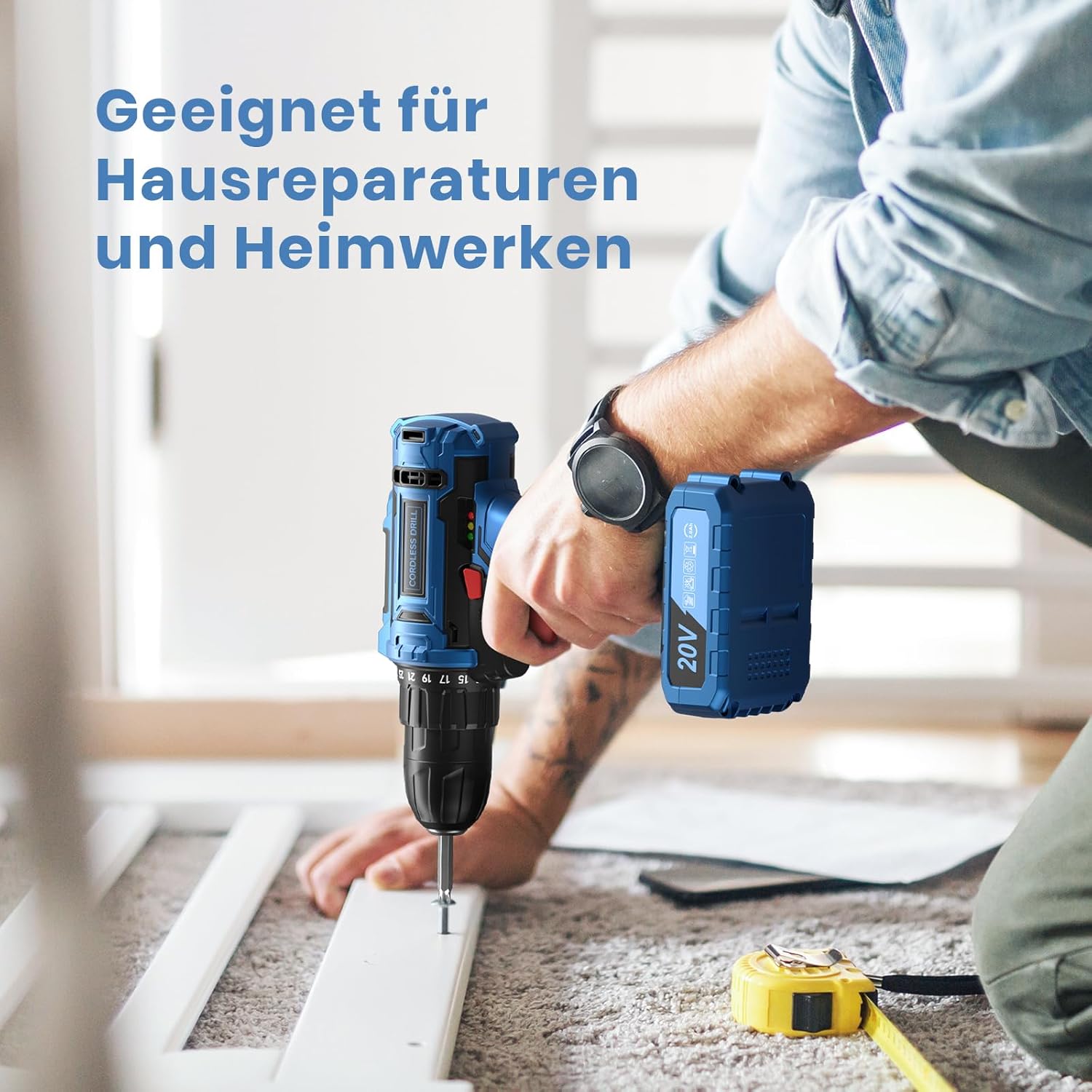 - Neues, verbessertes All-in-One-Zubehörset: 3 Spiralbohrer, 3 Spiralbohrer, 6 Schraubendreherbits, 1 Schraubendreherbit-Verlängerung, 1 Verlängerungswelle, 1 Bürstenkopf, 60 Dehnschrauben. Leichte Werkzeugtasche für den Akkubohrer und das gesamte