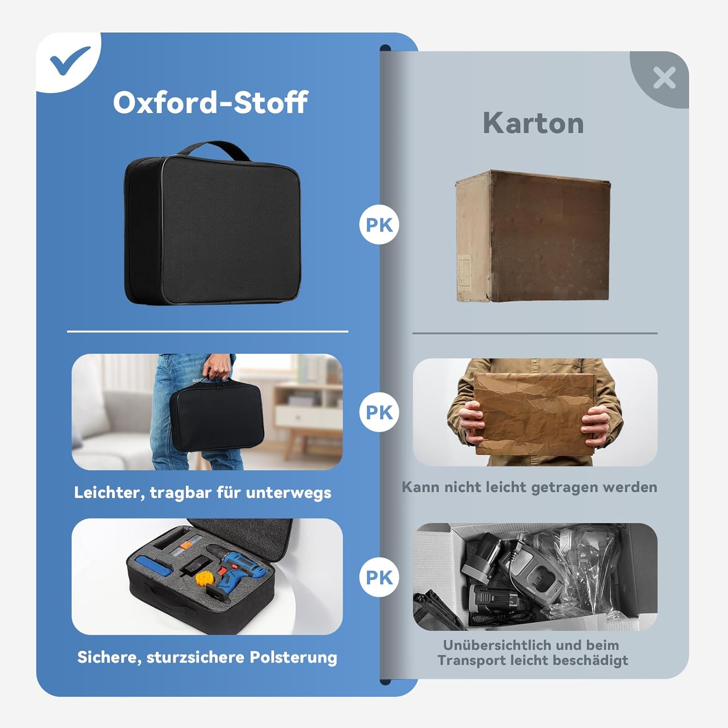 - Wir machen jedes Detail sorgfältig:Die Drehrichtung des Bohrers kann flexibel zwischen Rechts- und Linkslauf umgeschaltet werden; die Tragetasche ist leicht und stabil und bietet Ihnen ein tragbares Erlebnis und Schutz; hochwertige LED-Leuchten