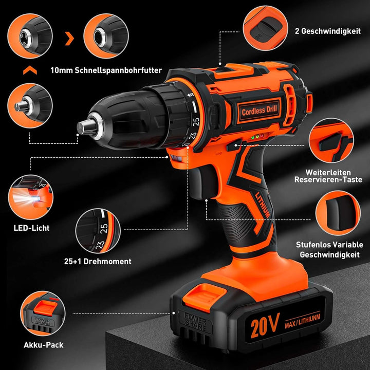 - Leistungsstarke und Wissenschaftliche Zubehorkomination:Hochwertiges Metall wird nach einem strengen Prozess schliesslich zum Zubehör für diesen Akkuschrauber; 6 x Schraubendreher, 3 x Spiralbohrer, 3 x Brad Point Bohrer, 9 x Steckschlüssel, 1 x